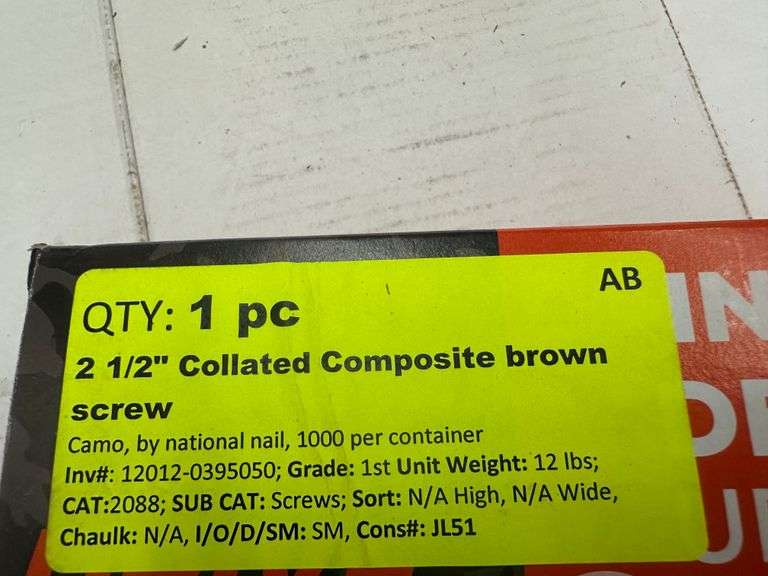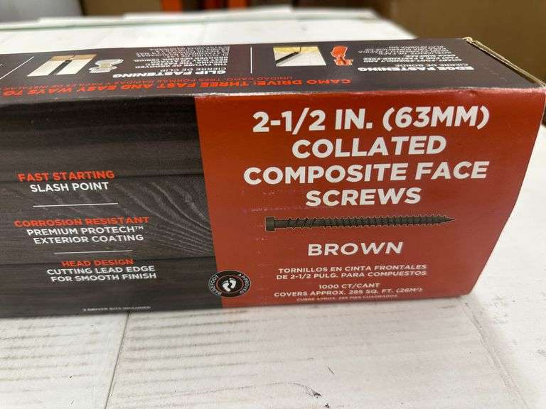 2 1/2" Collated Composite Brown Screws. Camo, By National Nail, 1000 Per Container, Grade: 1st Weight: 12. Sold by: Piece. Sold as: Price x Quantity.
