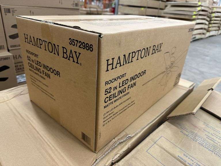 Rockport 52" LED Indoor Ceiling Fan. By Hampton Bay, Matte White Finish, (3) 9W LED Bulbs, Quiet Motor Technology, Reversable Blades, Assembled Dimensions 52"x19.5", Grade: A Weight: 25. Sold by: Piece. Sold as: Price x Quantity.