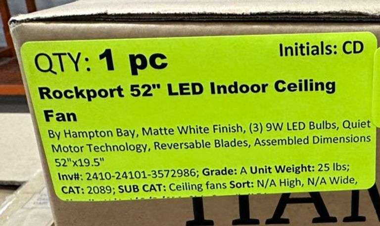 Rockport 52" LED Indoor Ceiling Fan. By Hampton Bay, Matte White Finish, (3) 9W LED Bulbs, Quiet Motor Technology, Reversable Blades, Assembled Dimensions 52"x19.5", Grade: A Weight: 25. Sold by: Piece. Sold as: Price x Quantity.