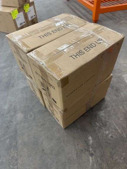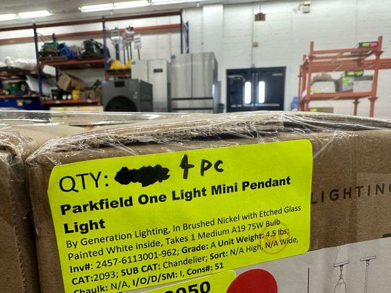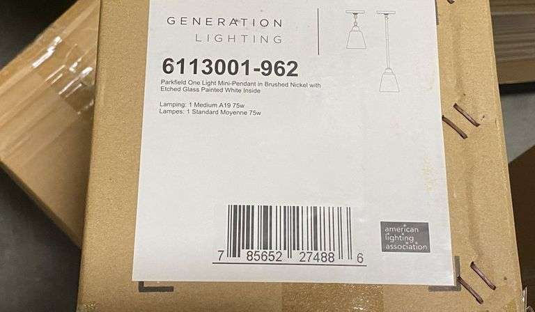 4 Pack Parkfield One Light Mini Pendant Light. By Generation Lighting, In Brushed Nickel with Etched Glass Painted White Inside, Takes 1 Medium A19 75W Bulb, Grade: A. Weight: 18. Sold by: Piece. Sold as: Price x Quantity.