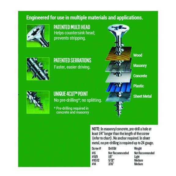 Zinc Interior Multi-Material Screws #14 x 4-3/4". Unidrive, Flat Head, 10 Boxes of 8 Piece Per Case Weight: 3. Sold by: Case. Sold as: Price x Quantity.