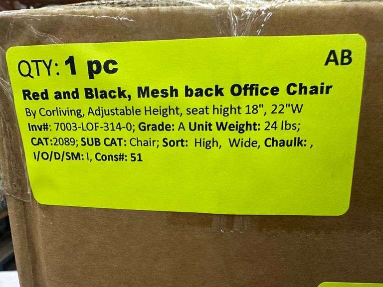 Red and Black Mesh Back Office Chair. By: Corliving, Adjustable Height, Seat Height 18", 22" Width, Grade: A Weight: 24. Sold by: Piece. Sold as: Price x Quantity.
