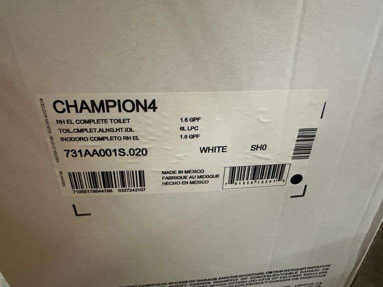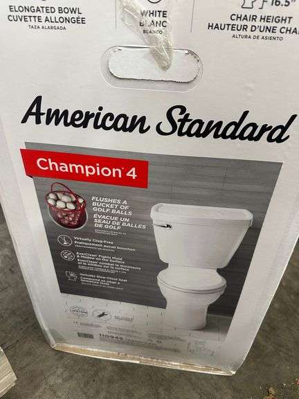 2 Piece Champion 4 Elongated White Toilet. By: American Standard, Two-Pieces, 1.6 GPF, Chair Height, Elongated Toilet with Seat, EverClean Surface, Complete Kit For Installation, Clog Free 2 3/8" Trapway, Grade: A Weight: 110. Sold by: Piece. Sold as: Price x Quantity.