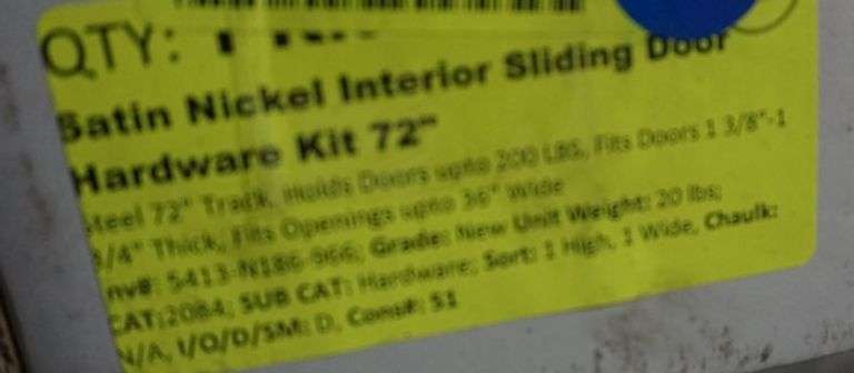 Satin Nickel Interior Sliding Door Hardware Kit 72". Steel 72" Track, Holds Doors upto 200 LBS, Fits Doors 1 3/8"- 1 3/4" Thick, Fits Openings Upto 36" Wide. Grade: New Weight: 20. Sold by: Kit. Sold as: Price x Quantity.