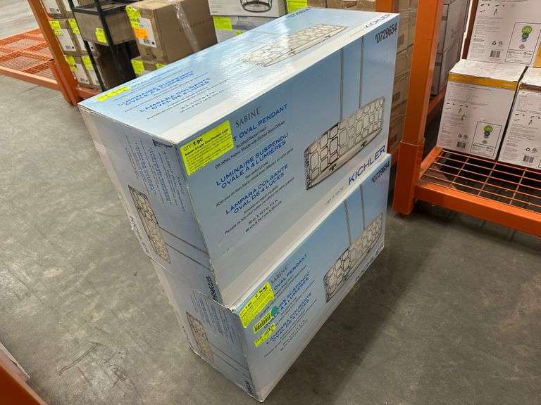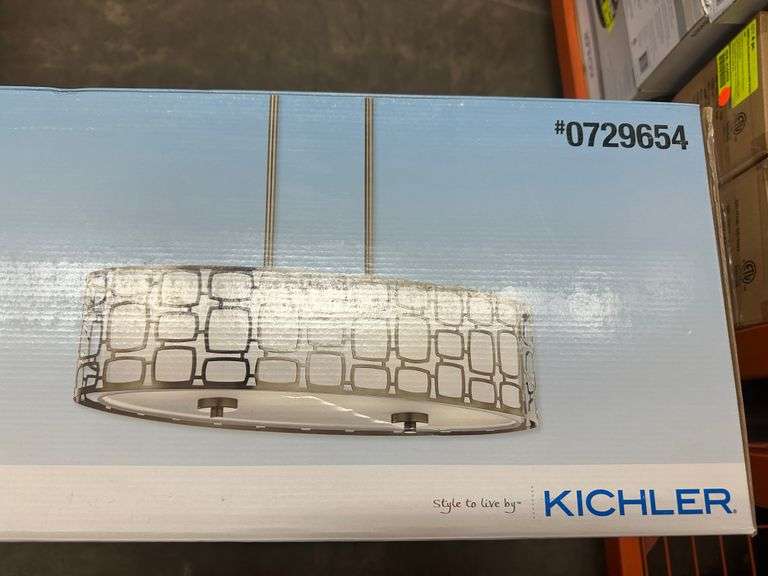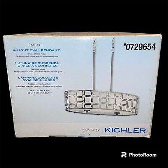 Sabine 4-Light Oval Pendant Light. By: Kichler, Brushed Nickel Finish, Off White Fabric Shade With Etched Glass Diffuser, 26"x13.7"x8" Rod/Chain Adjustable up to 108" .4 Standard Base, Type-A Bulbs or Standard Base, CFL Bulbs Required, Grade: A Weight: 15. Sold by: Piece. Sold as: Price x Quantity.