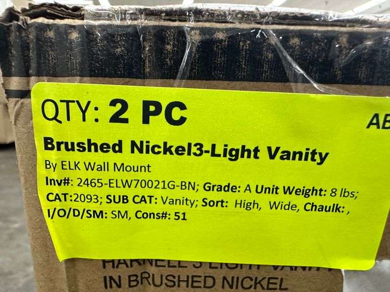 Brushed Nickel 3-Light Vanity Light. By: ELK Wall Mount, Grade: A Weight: 8. Sold by: Piece. Sold as: Price x Quantity.