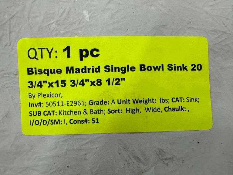 Bisque Madrid Single Bowl Sink 20 3/4"x15 3/4"x8 1/2". By Plexicor, Grade: A Weight: x. Sold by: Piece. Sold as: Price x Quantity.