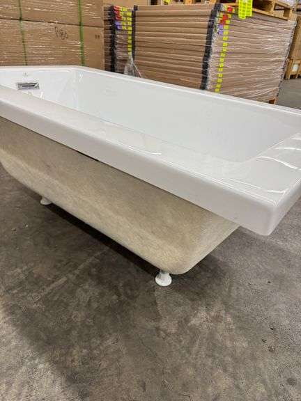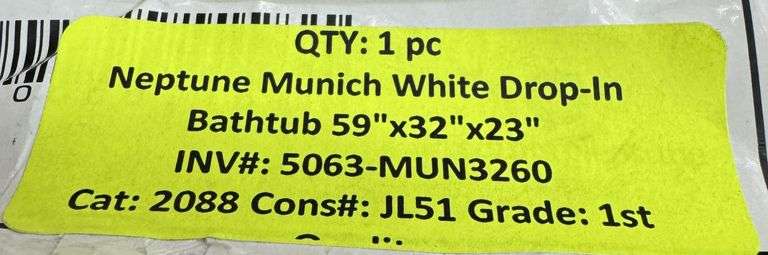 Neptune Munich White Drop-In Bathtub 59"x32"x23". Tub Only, Chrome Drain Included. AFR, Acrylic Surface, High Gloss Finish. 74 Gallon Water Capacity, 18* Back Slant. Actual Dimensions 58 7/8"x31 5/8"x23 1/8". Grade: 1st Quality Weight: x. Sold by: Piece. Sold as: Price x Quantity.