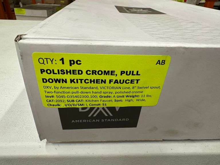 Polished Crome, Pull Down Kitchen Faucet. DXV, By American Standard, Victorian Line, 8" Swivel Spout, Two-Function Pull-Down Hand Spray, Polished Crome, Grade: A Weight: 11. Sold by: Piece. Sold as: Price x Quantity.
