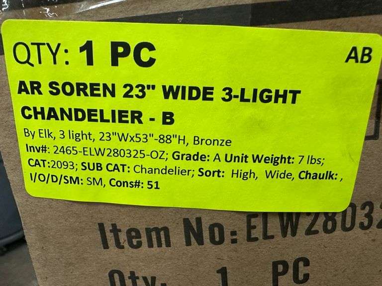 AR SOREN 23" WIDE 3-LIGHT CHANDELIER-B. By Elk, 3 Light, 23"Wx53"-88"H, Bronze, Grade: A Weight: 7. Sold by: Piece. Sold as: Price x Quantity.