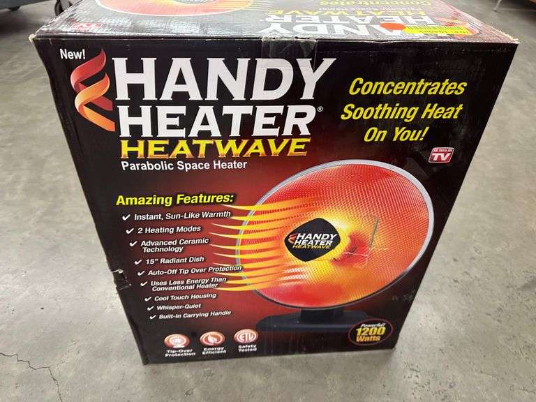 1200-Watt Electric Oscillating Ceramic Parabolic Space Heater. Open box but looks new. Fan-free operation allows quiet and comfortable use. Powerful 1200-watt heater with 2 heating modes for convenience. Large curved radiant face ensures instant and soothing warmth Weight: . Sold by: . Sold as: Price x Quantity.