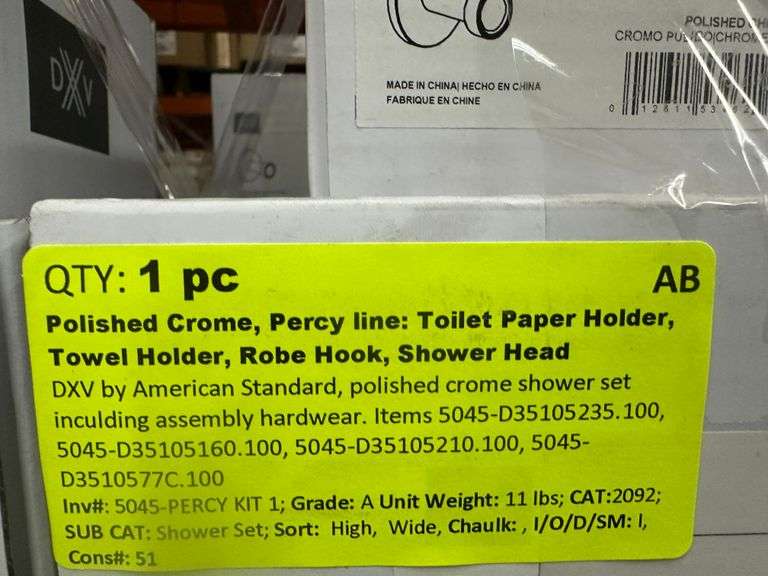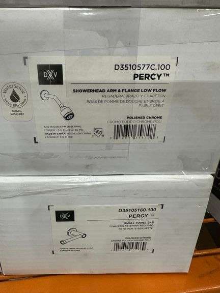 Polished Chrome, Percy Line: Robe Hook, Tissue Holder, Showerhead Arm & Flange Low Flow, Small Towel. DXV by American Standard, Polished Chrome Shower Set including Assembly Hardware. Lems 5045-D35105235.100, 5045-D35105160.00, 5045-D35105210.100, 5045-D3510577C.100 Weight: 11. Sold by: Piece. Sold as: Price x Quantity.