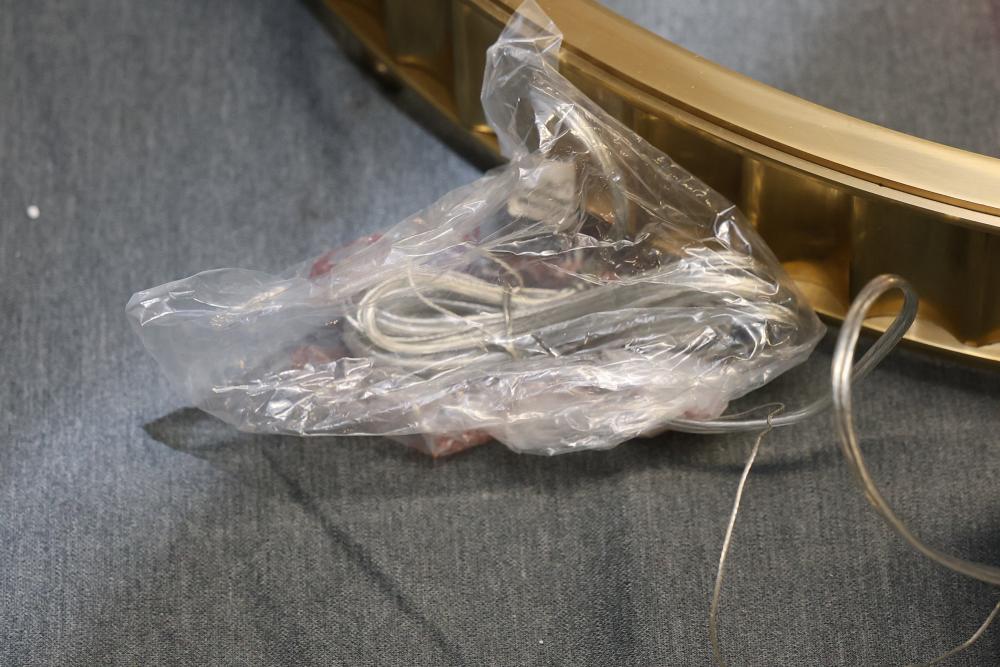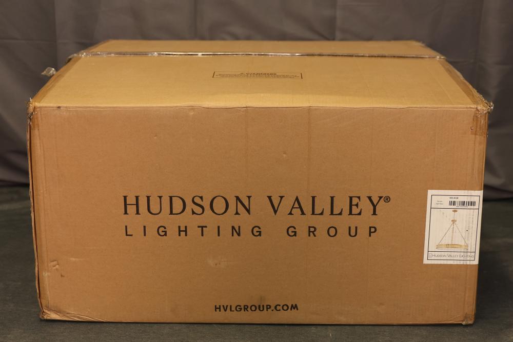 Hudson Valley Lighting Aged Brass Pendant 903-AGB. Includes an aged brass frame, white round diffuser, chains, hardware, and wiring components as shown. Item is new in an open box and appears unused. Pickup only.
