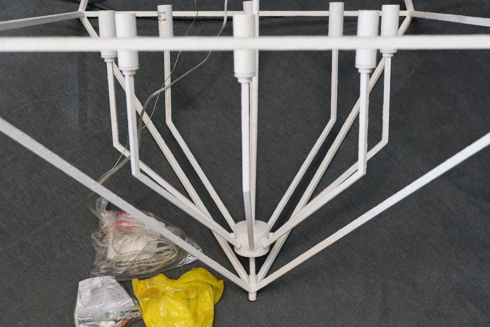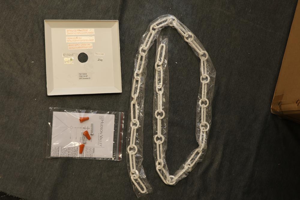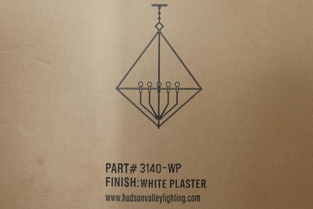 Hudson Valley Lighting White Plaster Chandelier Frame. Includes chandelier frame, wiring components, ceiling mount hardware, and chain. The frame design accommodates multiple lightbulbs and features a durable white plaster finish. Part #3140-WP as labeled. Pickup only.