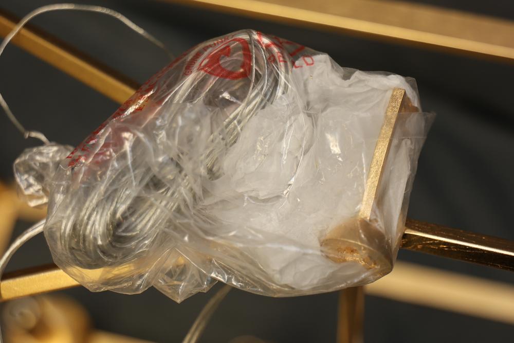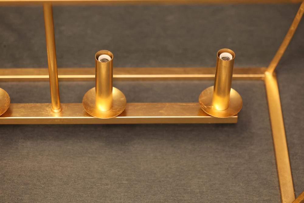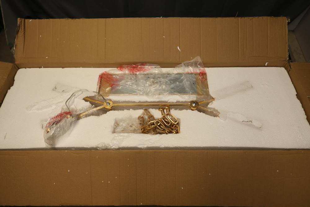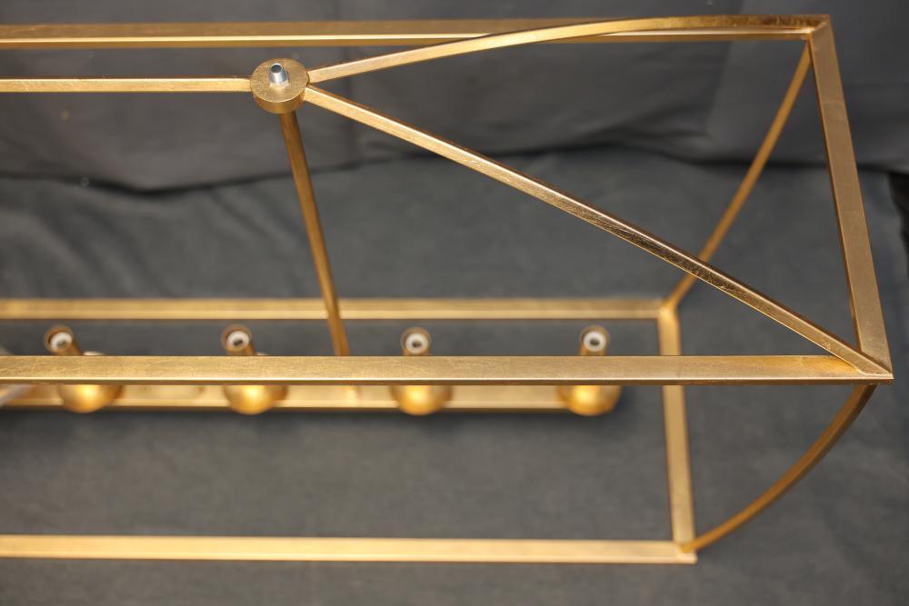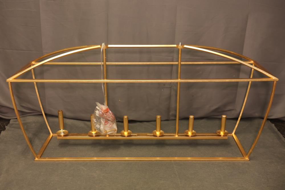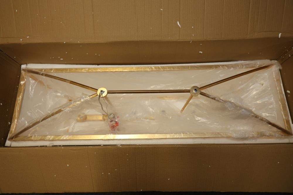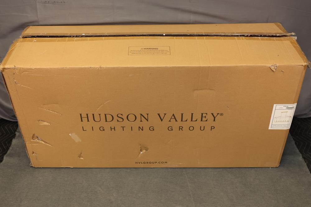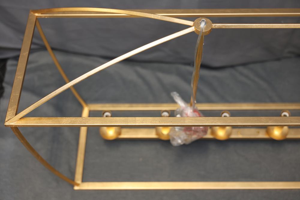 Hudson Valley Gold Leaf Linear Suspension Light Fixture with a metal frame and gold finish. Includes multiple light sockets and original packaging with installation hardware and instructions. Item is new in box. Pickup only.