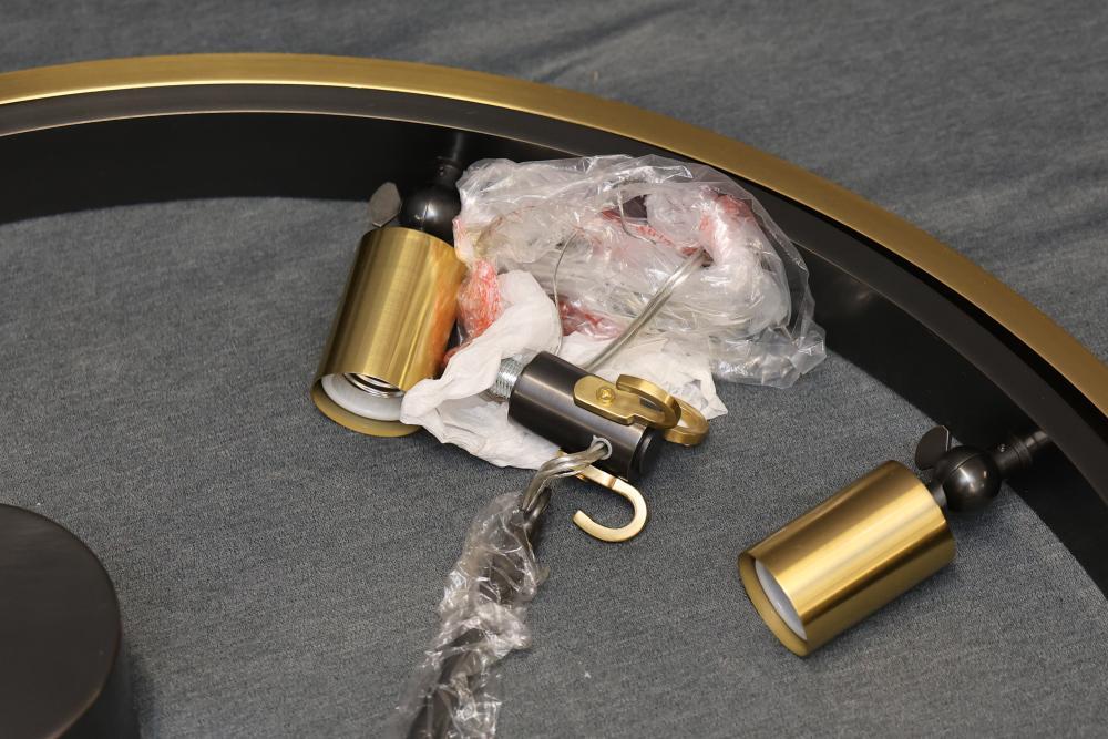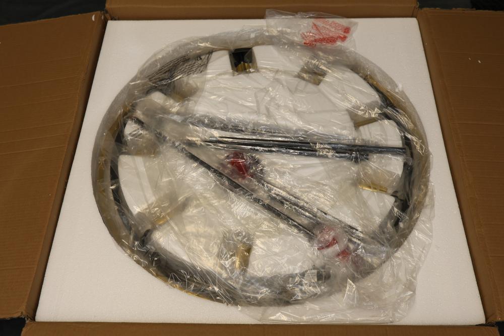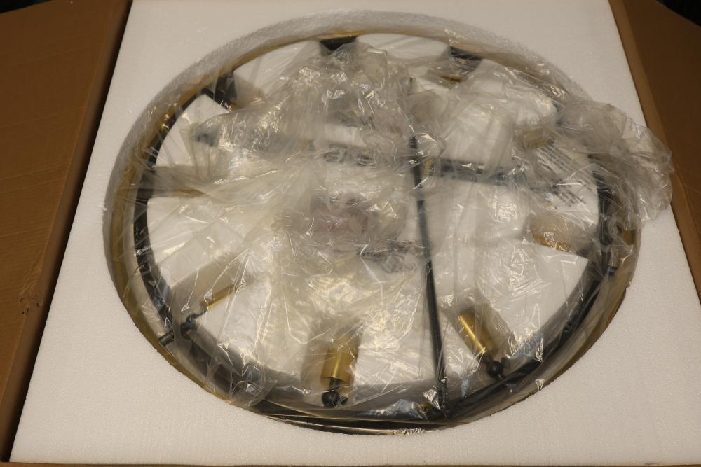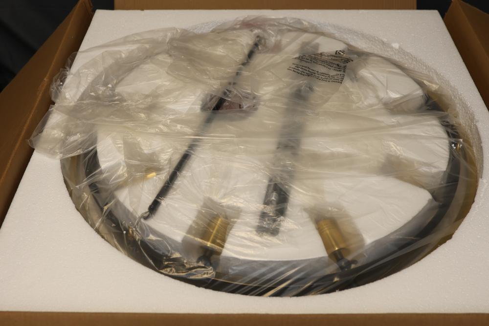 Sunlite LED Decorative Ceiling Fixture 13 Inch Double Round Black and Gold. Features 1000 lumens, 20-watt power, and a lifespan of 50,000 hours with a color tunable switch (3000K/4000K/5000K). Dimmable and suitable for damp locations. Includes mounting hardware and designed for ceiling installation. Pickup only.