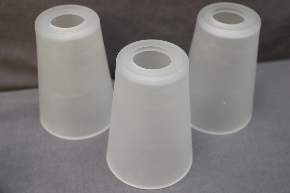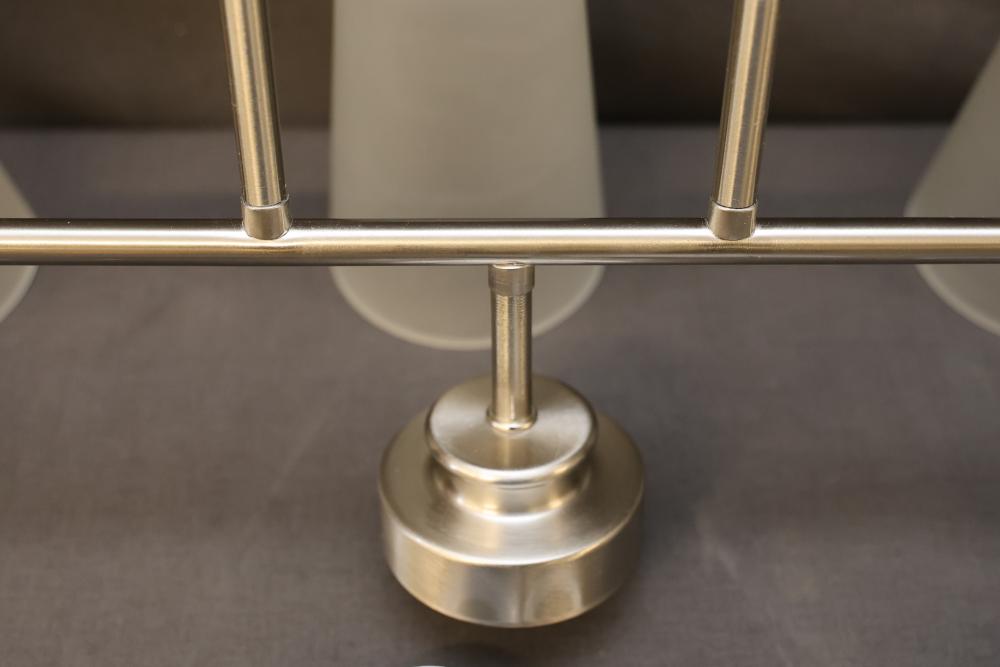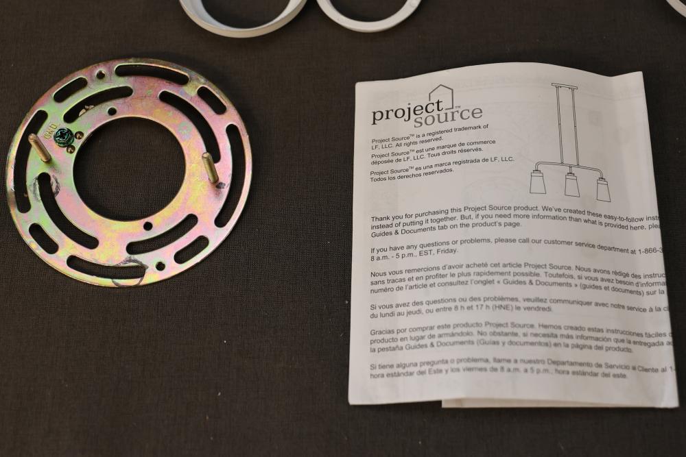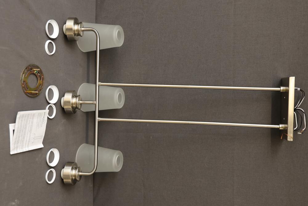 Project Source 3-Light Linear Pendant with Frosted Glass Shades. Includes brushed nickel finish, hardware, and frosted glass shades. Model number 1341842. Designed for ceiling mounting with a modern aesthetic. Documentation for installation is also included. Pickup only.