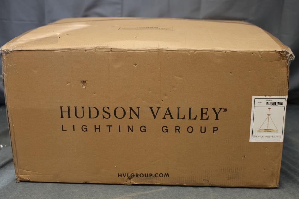 Hudson Valley Lighting pendant in aged brass, model 903-AGB. Includes all components such as chains, hardware, mounting fixtures, and white acrylic diffuser. Constructed with a durable brass finish and designed for ceiling installation. Pickup only.