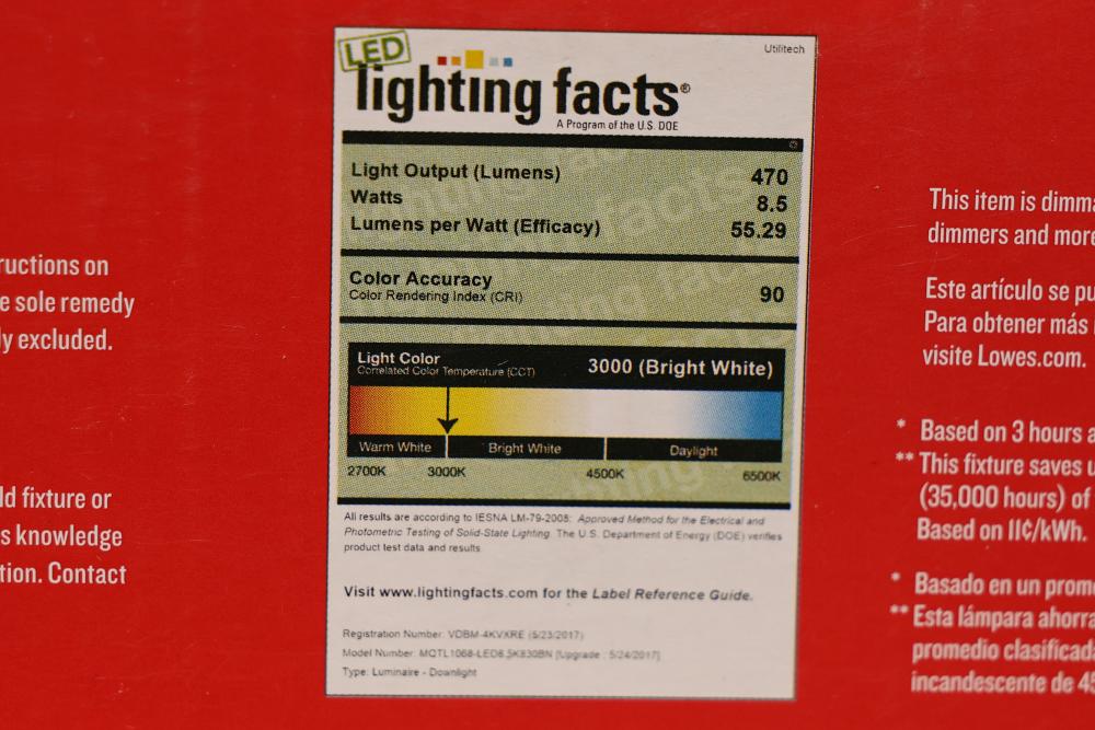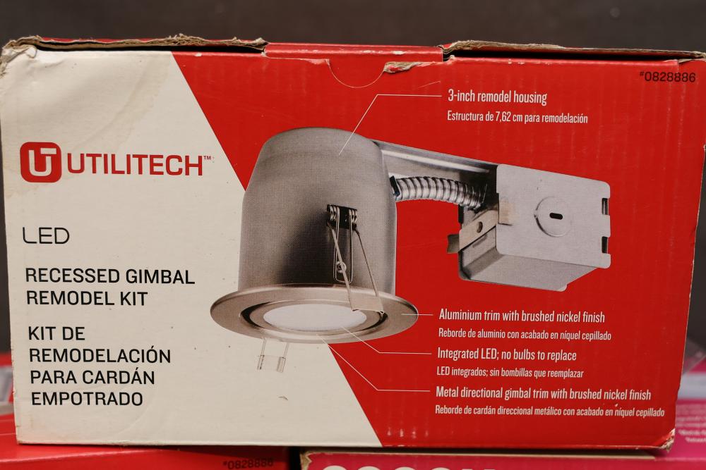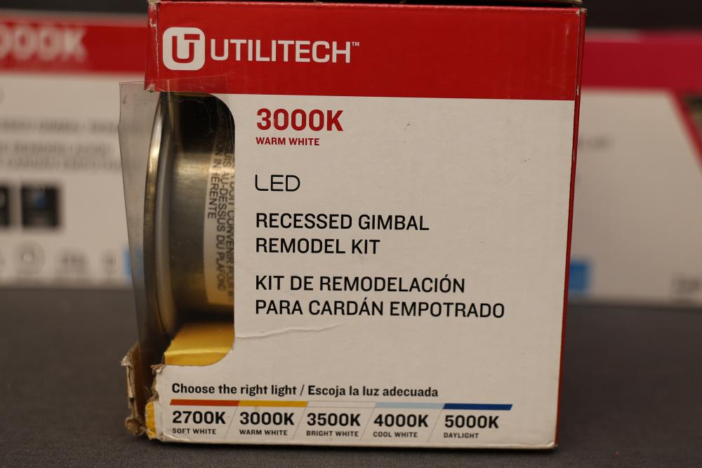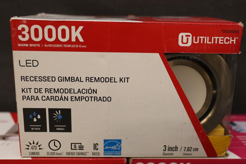 Utilitech 3000K LED Recessed Gimbal Remodel Kits, 3-Inch, Set of 3. Includes 3 LED recessed gimbal remodel kits with 470 lumens, 8.5 watts, and color accuracy of 90 CRI. Features warm white light at 3000K, aluminum trim with brushed nickel finish, and IC rated housing. Suitable for insulated environments with dimmer compatibility. Pickup only.