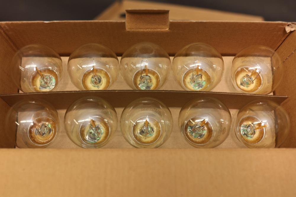 GE LED String Light Replacement Bulbs, 40 Bulbs Total. Includes four boxes containing 10 bulbs each, designed for outdoor use with a soft white light appearance. Each bulb is 1 watt, with a brightness of 60 lumens and an estimated life of 13.7 years based on 3-hour daily usage. Includes screw-type E26 bases and an energy-saving design. Pickup only.