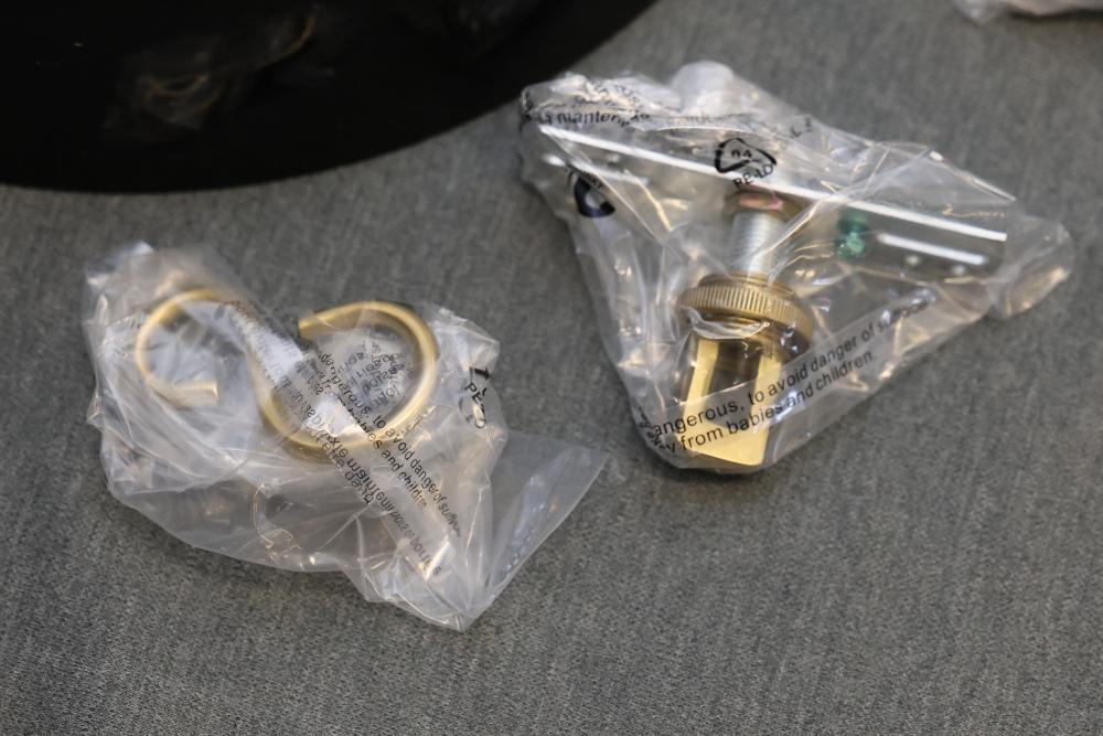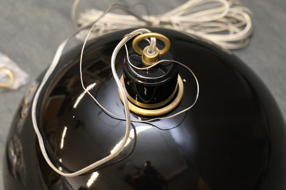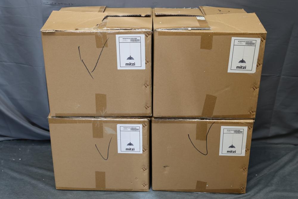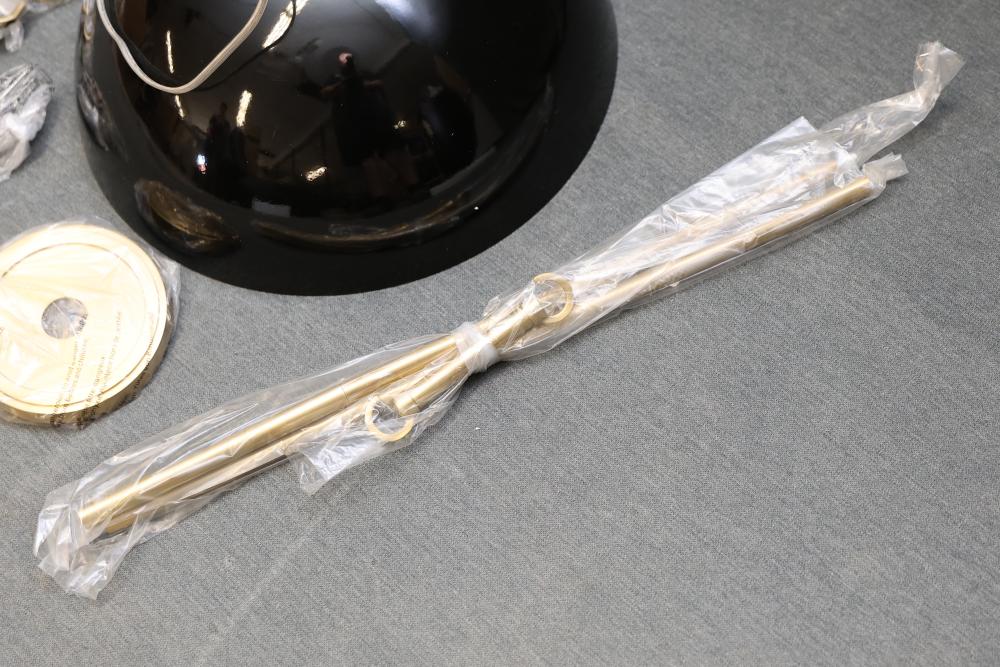 Mitzi H769701S-AGB/GBK Pendant Light in Aged Brass and Black. Includes dome-shaped black shade, brass mounting hardware, and wiring components. Original packaging with assembly parts as shown. Pickup only.