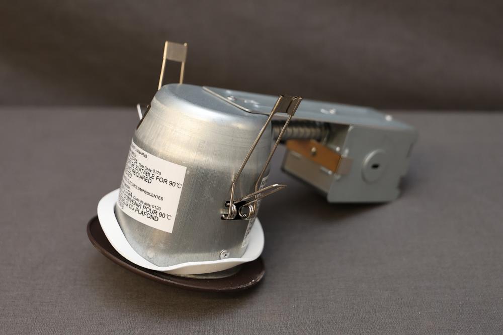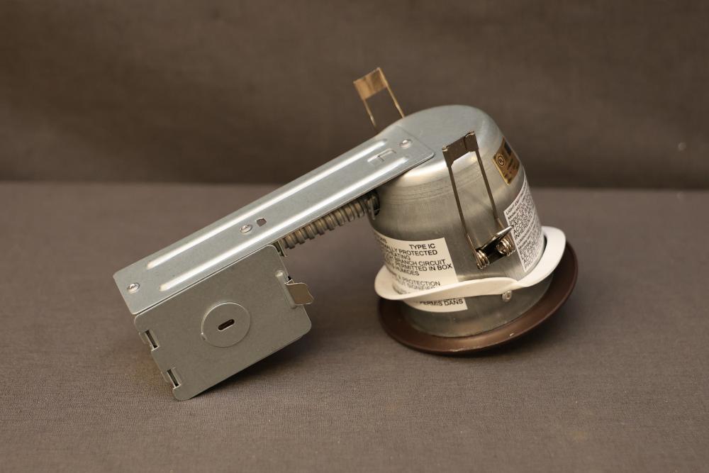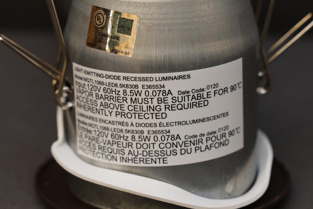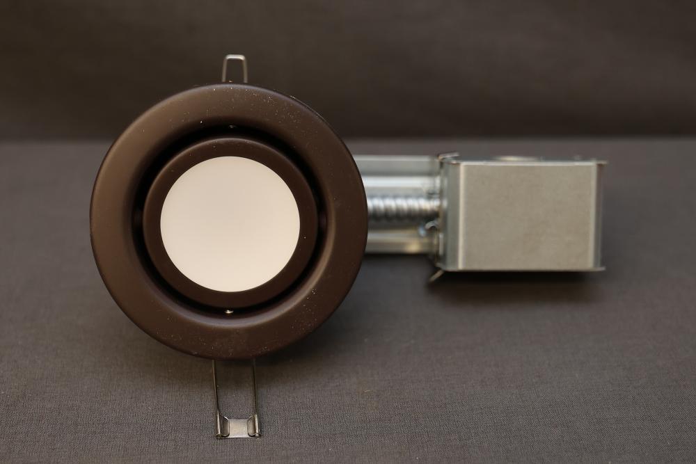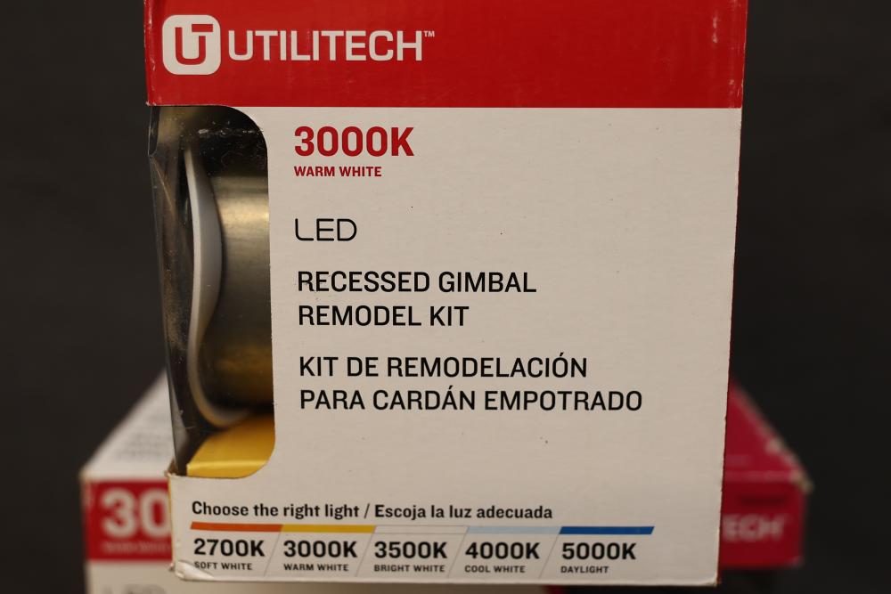 Utilitech LED Recessed Gimbal Remodel Kits, 2-Pack, 3000K. Each kit includes a 3-inch remodel housing and LED light providing a 3000K warm white color temperature, 470 lumens, and 8.5 watts with 55.29 lumens per watt. The lights feature aluminum trims with bronze finish and directional adjustments. IC rated for insulation contact and damp location listed.