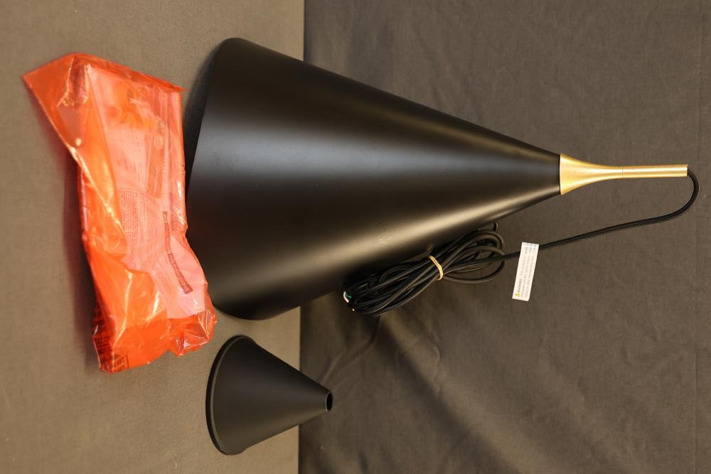 Hudson Valley Martini 9613-GL/BLK Pendant Light in Black and Gold. Features a conical black shade with gold interior accents, a gold-toned metal top, and attached black wiring. Includes installation hardware and packaging. Pickup only.