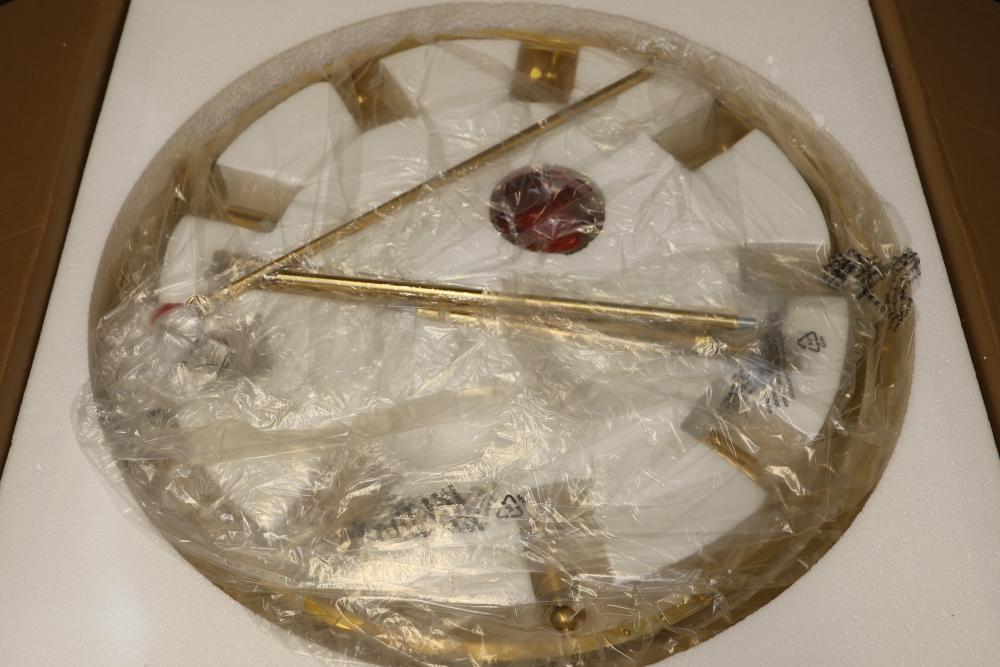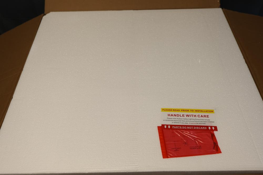 Hudson Valley Lighting 2732-AGB Pendant in Aged Brass. Includes multiple components for assembly, with detailed parts and instruction labels included in packaging. Constructed with a gold-toned aged brass finish. Set contains unopened boxes with carefully packaged pieces for protection. Pickup only.
