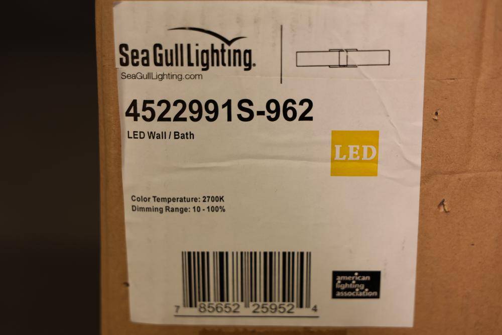 Sea Gull Lighting 4522991S-962 LED Wall/Bath Fixture featuring a color temperature of 2700K and a dimming range of 10-100%. Includes key components such as mounting hardware and LED strip. Pickup only.
