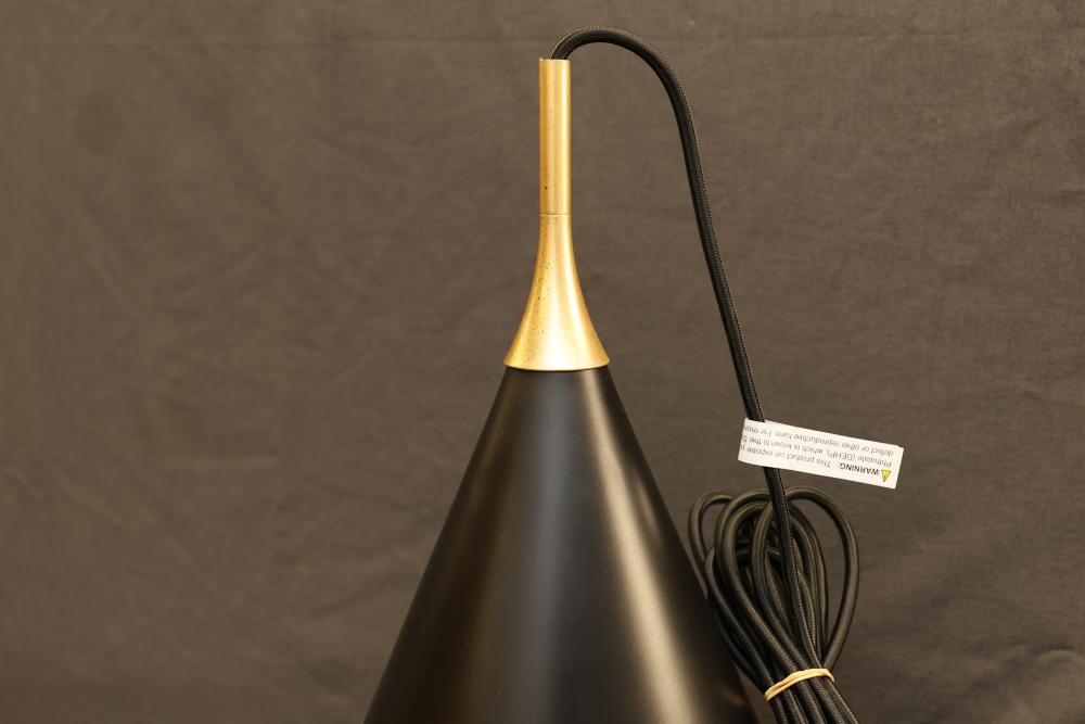 Hudson Valley Martini 9613-GL/BLK Cone Pendant Light Fixture with black and gold finish. Includes a conical shade, mounting hardware, and installation instructions. Comes with wiring for installation and is packaged in its original box. Pickup only.