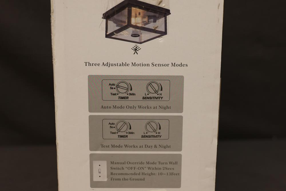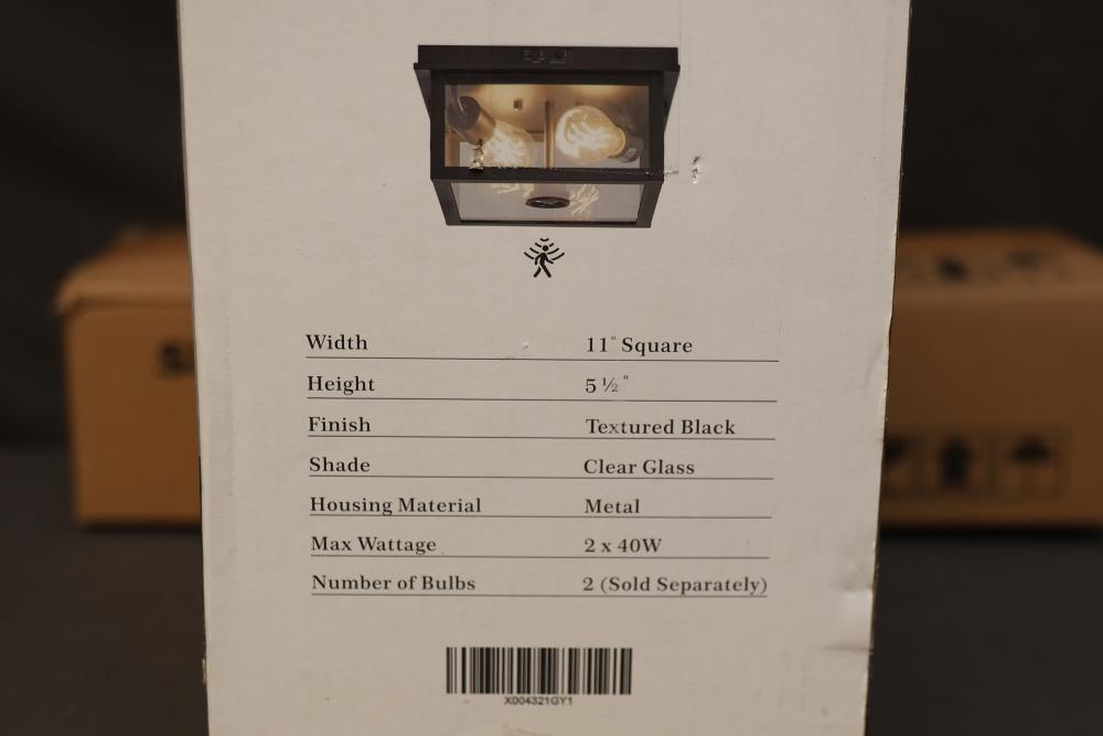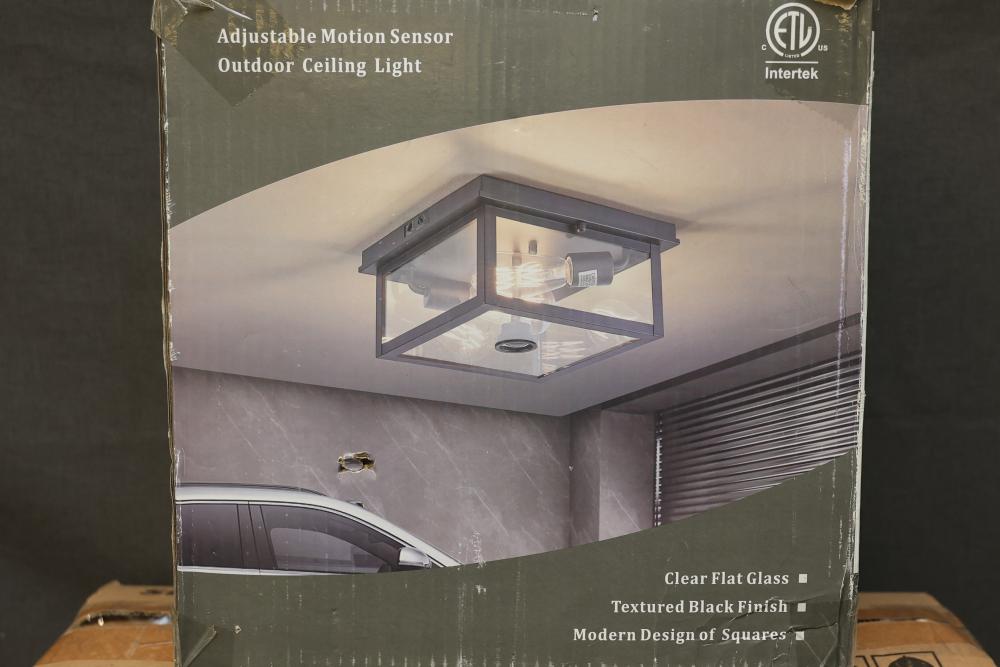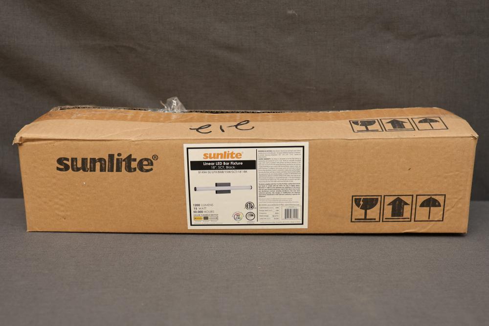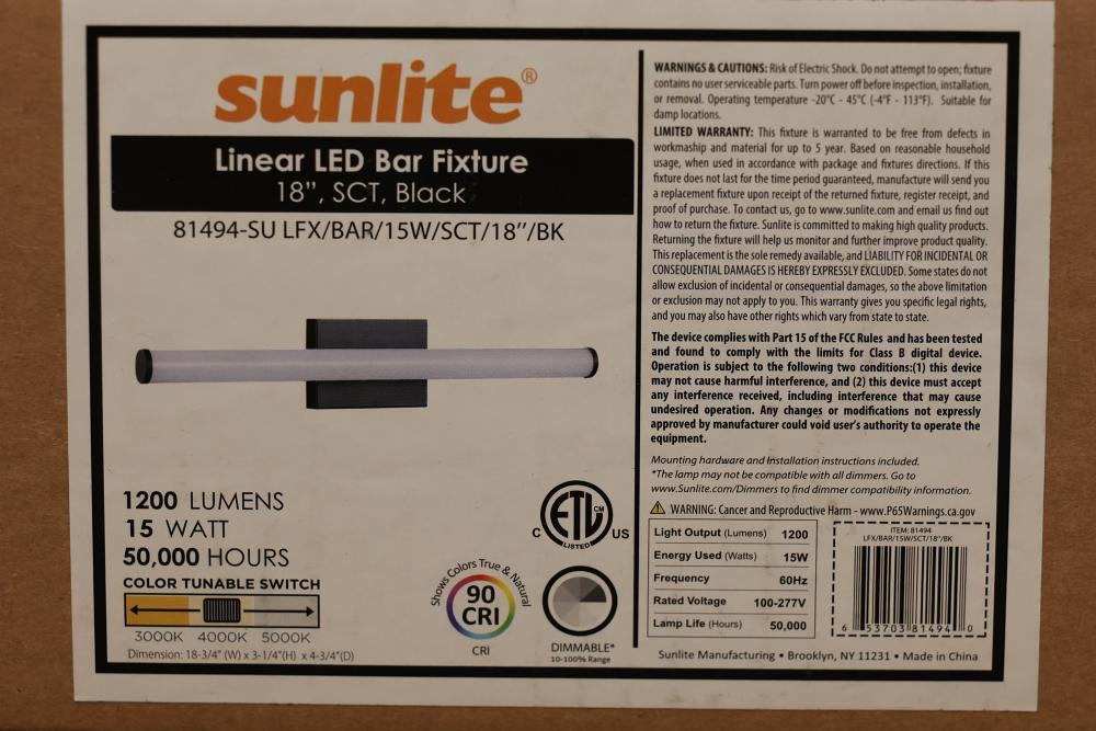 Sunlite Linear LED Bar Fixture 18-inch SCT in black finish delivers 1200 lumens at 15 watts with a color-tunable switch (3000K/4000K/5000K) and a lifespan of 50,000 hours. Dimmable and ETL listed. Accompanied by an adjustable motion sensor outdoor ceiling light featuring a clear glass shade, textured black metal housing, and three motion sensor modes. Requires two bulbs (sold separately), max wattage 2x40W. Pickup only.