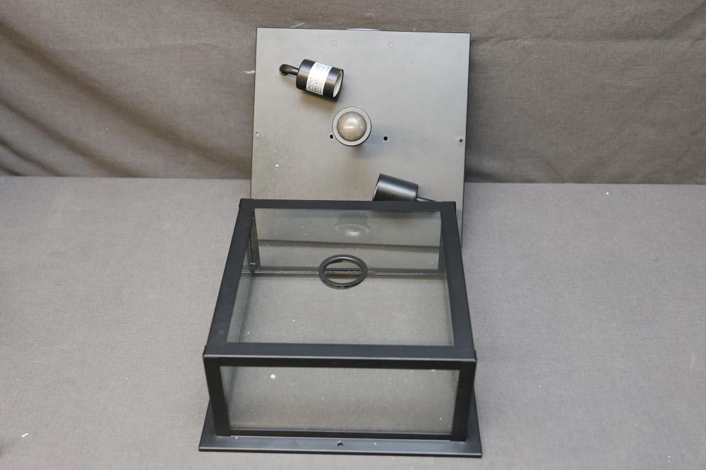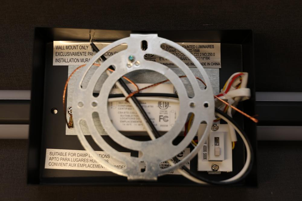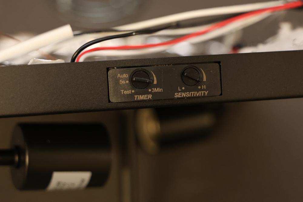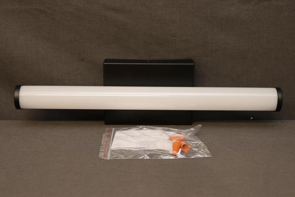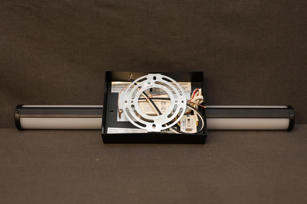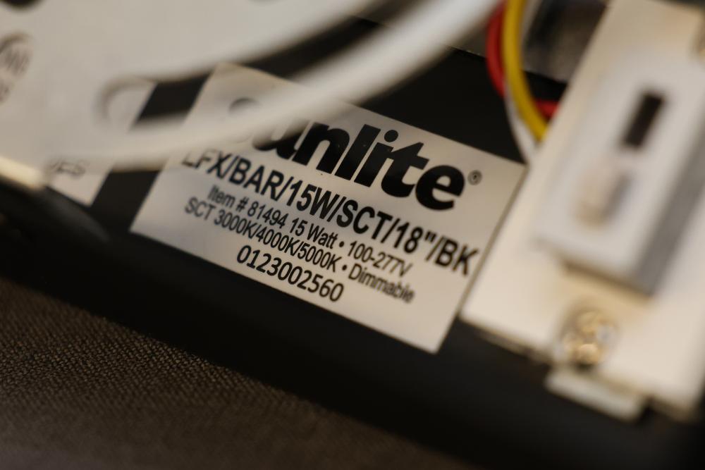 Sunlite Linear LED Bar Fixture 18-inch SCT in black finish delivers 1200 lumens at 15 watts with a color-tunable switch (3000K/4000K/5000K) and a lifespan of 50,000 hours. Dimmable and ETL listed. Accompanied by an adjustable motion sensor outdoor ceiling light featuring a clear glass shade, textured black metal housing, and three motion sensor modes. Requires two bulbs (sold separately), max wattage 2x40W. Pickup only.