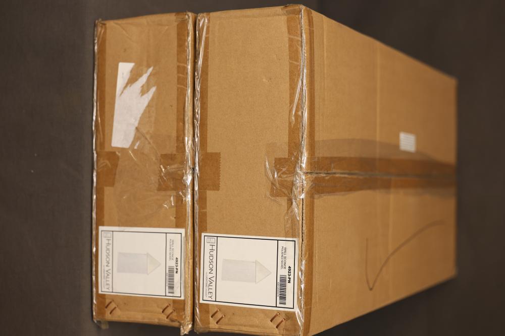 Hudson Valley 4923-PN Wall Sconce in Polished Nickel. The sconce features a modern design, including a triangular polished nickel component and a grooved glass design. Includes original packaging, hardware, and accessories as pictured. Pickup only.