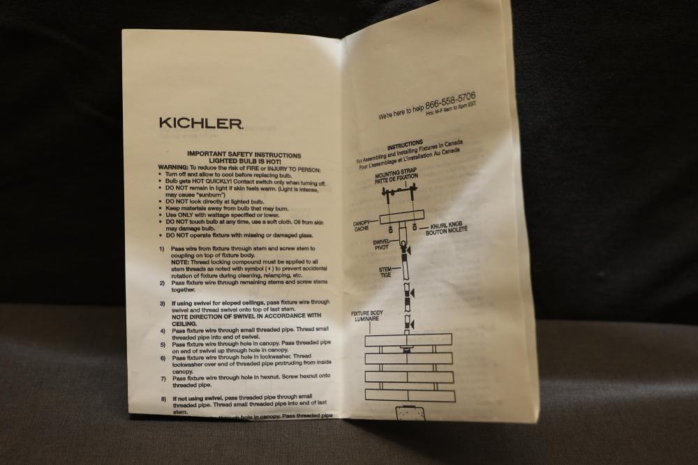 Kichler Brushed Nickel Pendant Light with Satin Etched Cased Opal Glass. Includes fixture components, wiring, mounting bracket, and instruction manual. Designed for 50W G9 bulb, which is included. Satin etched cased opal glass shade complements the brushed nickel finish. All parts appear to be intact and in original packaging. Pickup only.
