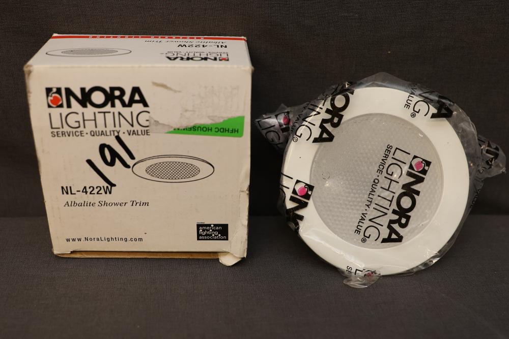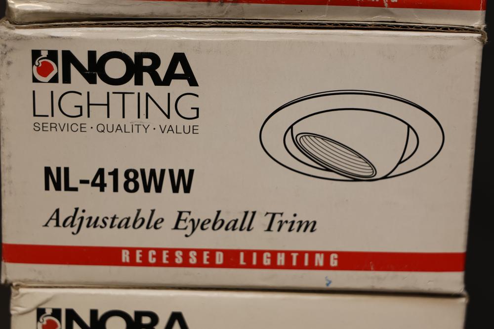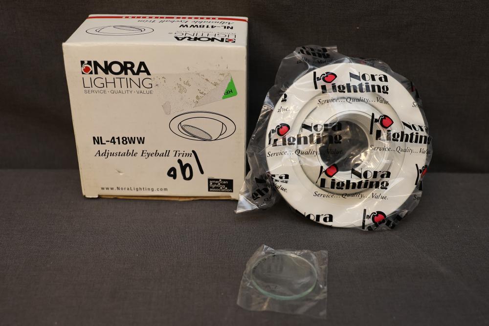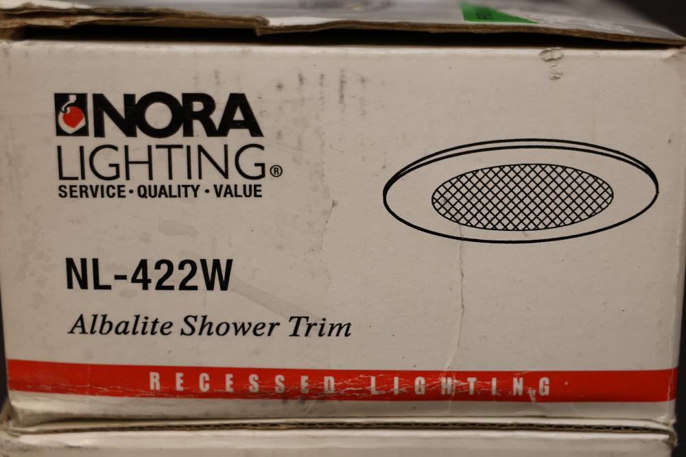 Nora Lighting Recessed Trim, Models NL-418WW and NL-422W. Includes adjustable eyeball trim and albalite shower trim designed for recessed lighting installations. Units appear in original packaging. Pickup only.