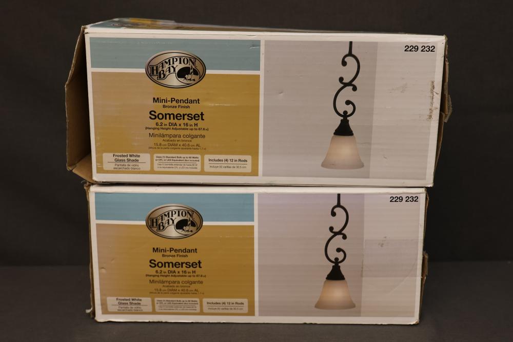 Hampton Bay Somerset Mini-Pendant Light Fixtures in Bronze Finish. Includes two light fixtures with frosted white glass shades, 6.25-inch diameter, 16-inch height, and H12 extension rods. Designed for indoor lighting applications.