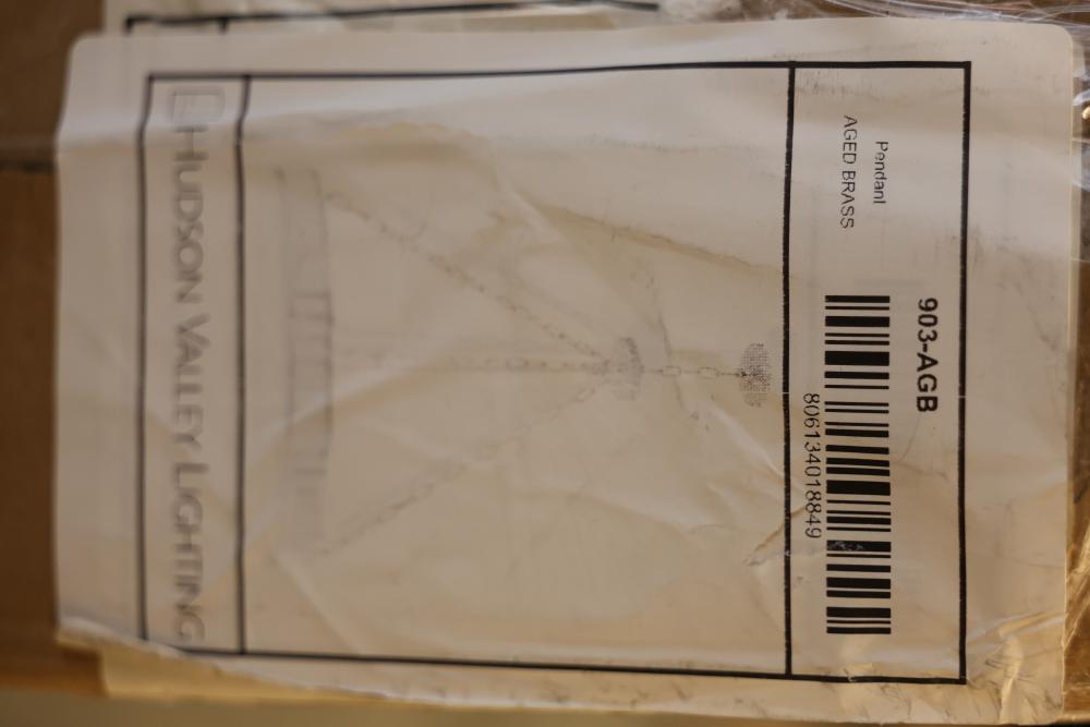Hudson Valley Lighting Pendant Model 903-AGB in aged brass finish. The fixture includes a round metal frame, chains, wiring, and a white glass shade. Packaged in its original box, it is suitable for ceiling installation. Pickup only.