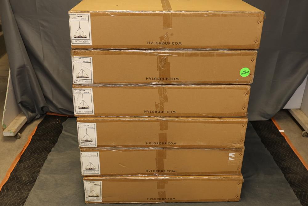 Hudson Valley Lighting Pendant Aged Old Bronze 2732-AOB. Featuring a metal frame and aged old bronze finish. Includes hardware components for assembly. Items are packaged in their original boxes with instructions. The pendant is designed for an elegant lighting solution. Pickup only.