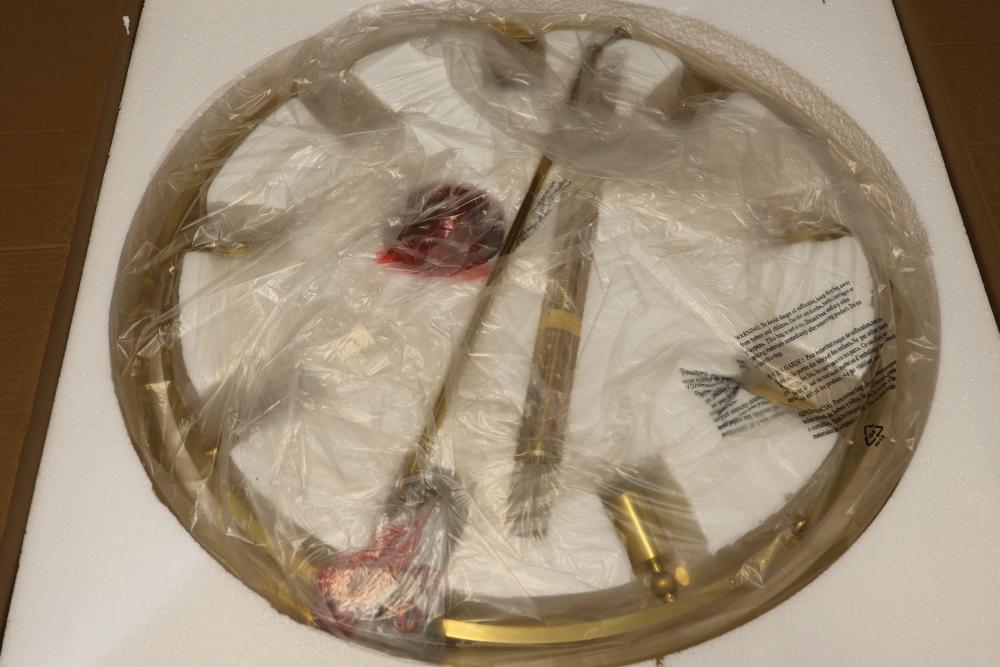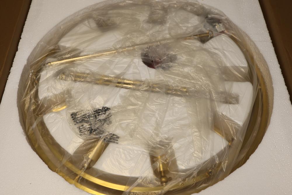 Hudson Valley Lighting Pendant in Aged Brass, Model 2732-AGB. This item includes all parts required for assembly, featuring a circular frame with multiple light fittings and aged brass finish. The lighting fixture is packaged in original boxes with protective materials. Suitable for indoor installation. Pickup only.