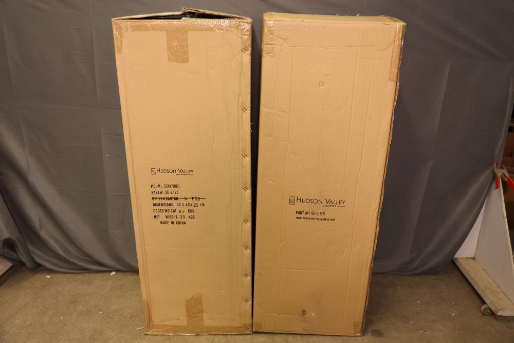 Hudson Valley SE-L125 Drum Lamp Shades in Original Packaging. Two boxes with 5 shades each, includes multiple identical drum-style lamp shades by Hudson Valley, model SE-L125. Each shade is wrapped in protective plastic and packaged in its original box. Constructed with durable materials. Pickup only.