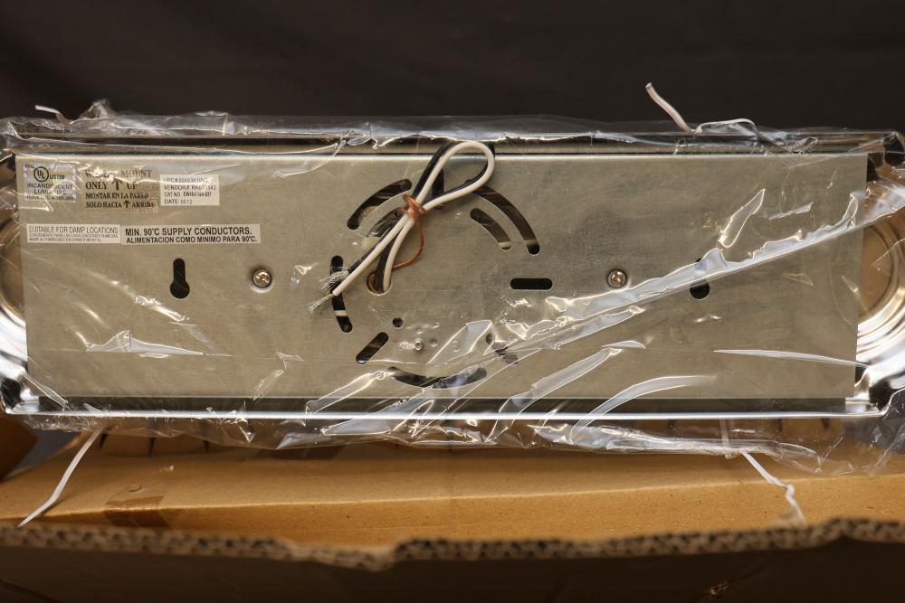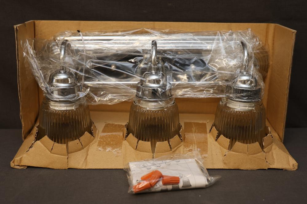 Hampton Bay Three-Light Bath Bar in Chrome Finish with clear ribbed glass shades. Uses three medium base bulbs, with a maximum wattage of 100W (bulbs sold separately). Assembled dimensions are 18" W x 7-3/4" H x 7-1/4" EXT. Includes installation hardware and instructions. Suitable for damp locations. Pickup only.