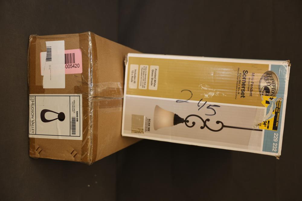 Items include Hudson Valley Lighting Polished Nickel Chandelier; Hudson Valley Pendant Light; American Craftsman 30 x 54 Double-Hung Vinyl Window; Hudson Valley Lighting Smoke Glass Panels; Style Selections Seacrest Dining Table; Nalle Energy Saving Ventilation Fan; Allen + Roth Surface Mount Framed Medicine Cabinet; Industrial-Grade Wall-Mounted Outdoor Light Fixture; Electric Shoe Polisher; Orbit B-hyve Smart WiFi Hose Faucet Timer; Hudson Valley SE-L125 Drum Lamp Shades; Kichler 15211-VGT Landscape Lighting Fixture; Moen GXP33C Garbage Disposal; Style Selections Log Rack; Stainless Steel Sink Basin; Cosmo 30-Inch Under Cabinet Range Hood; Sunlite LED Decorative Ceiling Fixture & more. Items are located in Pleasant Valley, NY.