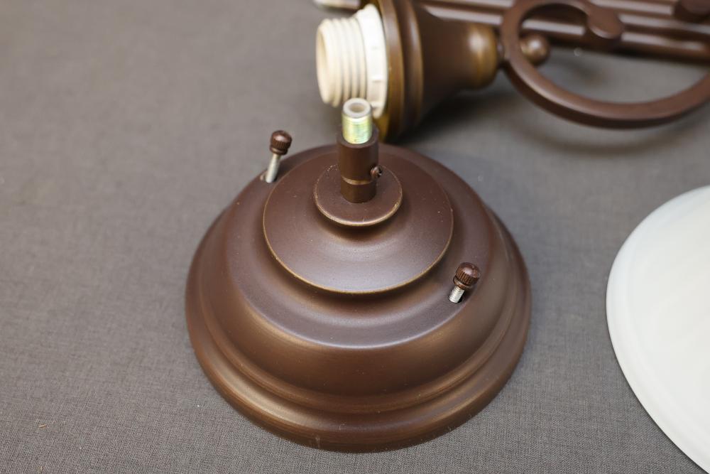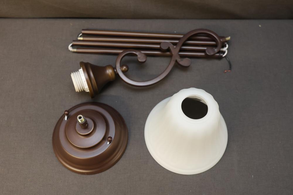 Hudson Valley Wall Sconce in Old Bronze with components. Includes a frosted glass shade, metal mounting base, decorative arm, and other installation parts, as shown. All parts appear to fit the model 5400-OB. Pickup only.
