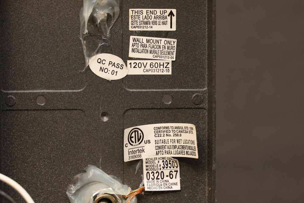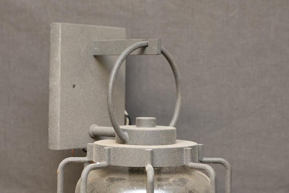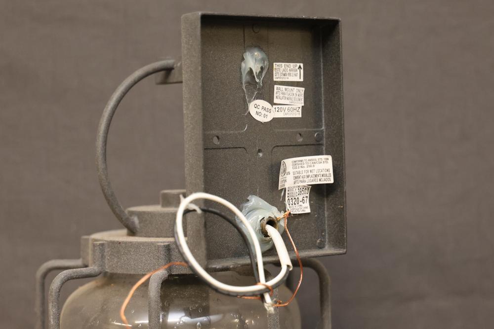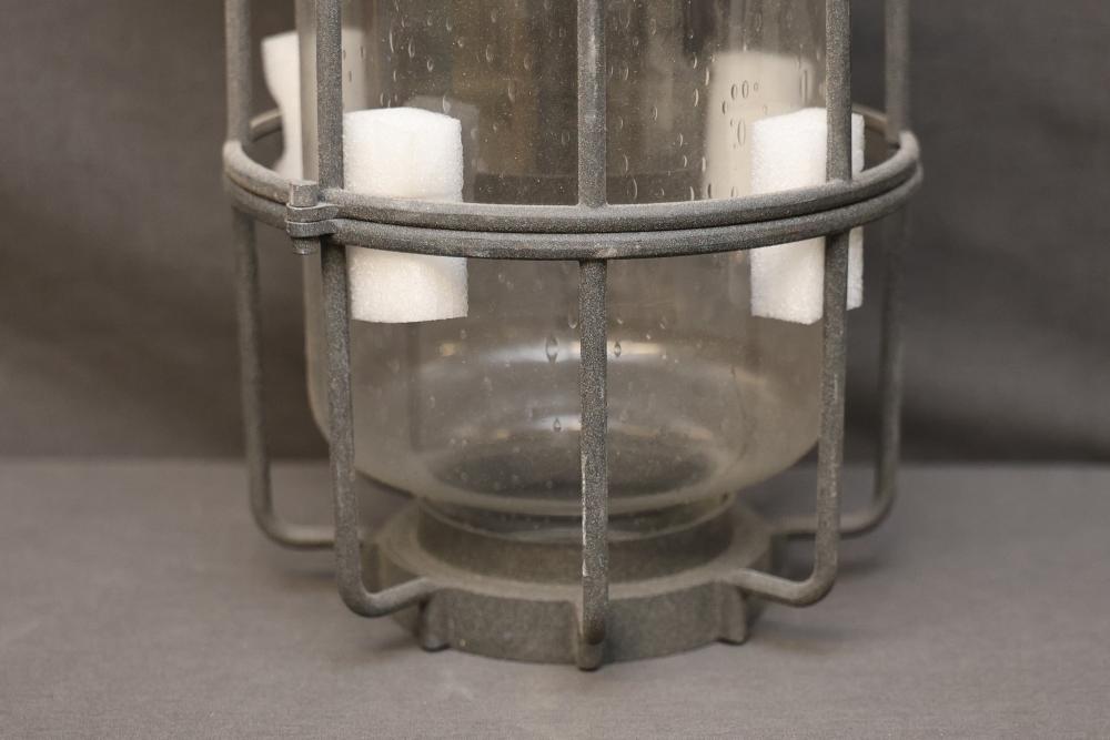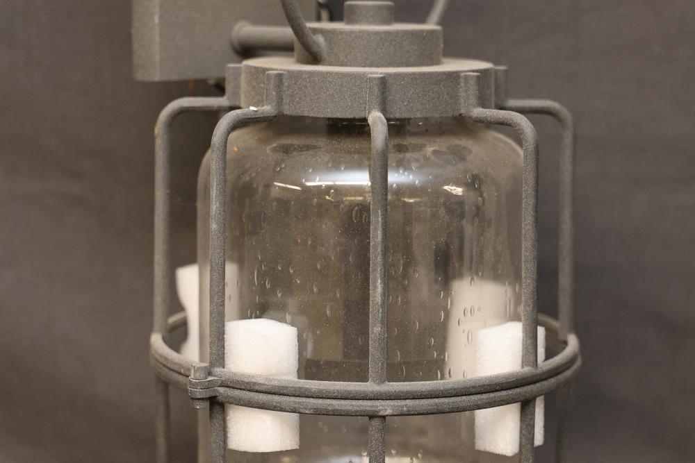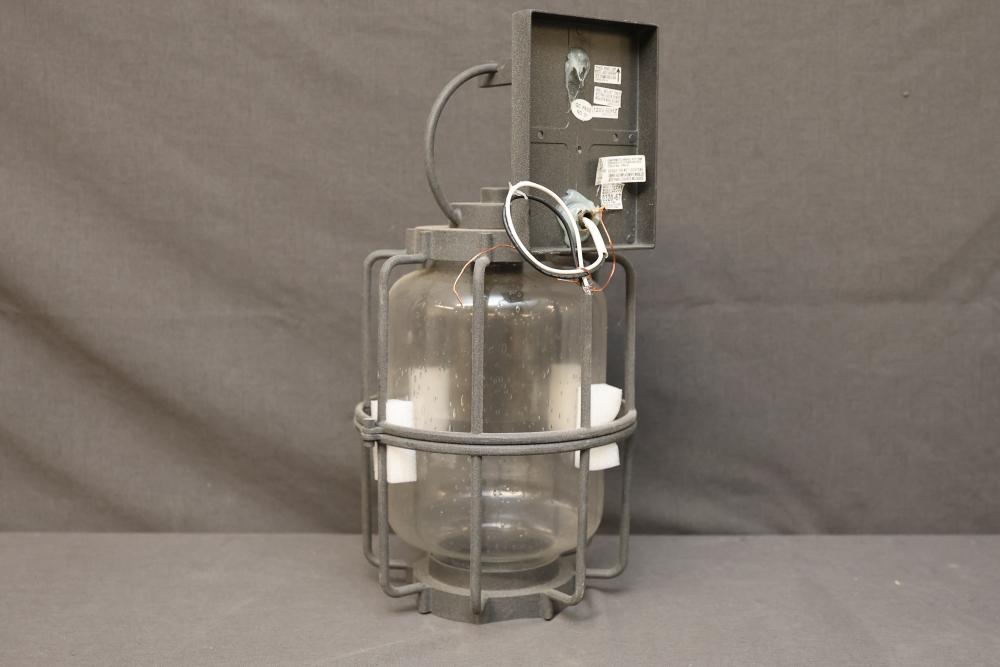 Wall-Mounted Industrial Outdoor Light Fixture with Glass Enclosure. Constructed with a durable metal frame and clear glass, this light fixture is designed for 120V 60Hz power. Labels indicate compliance with safety certifications. Suitable for wall mount installation. Pickup only.