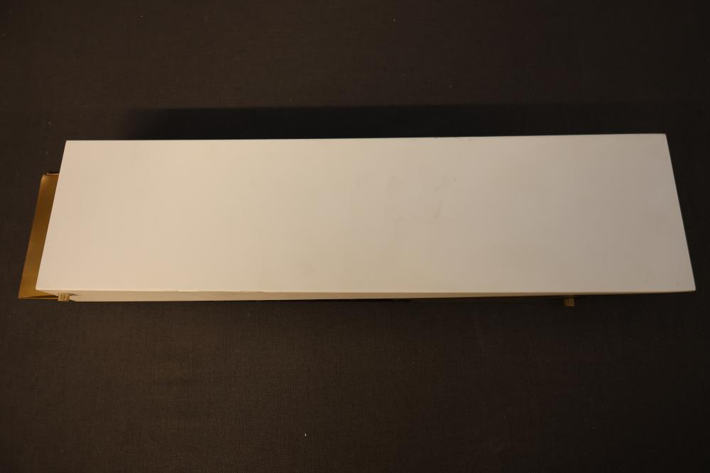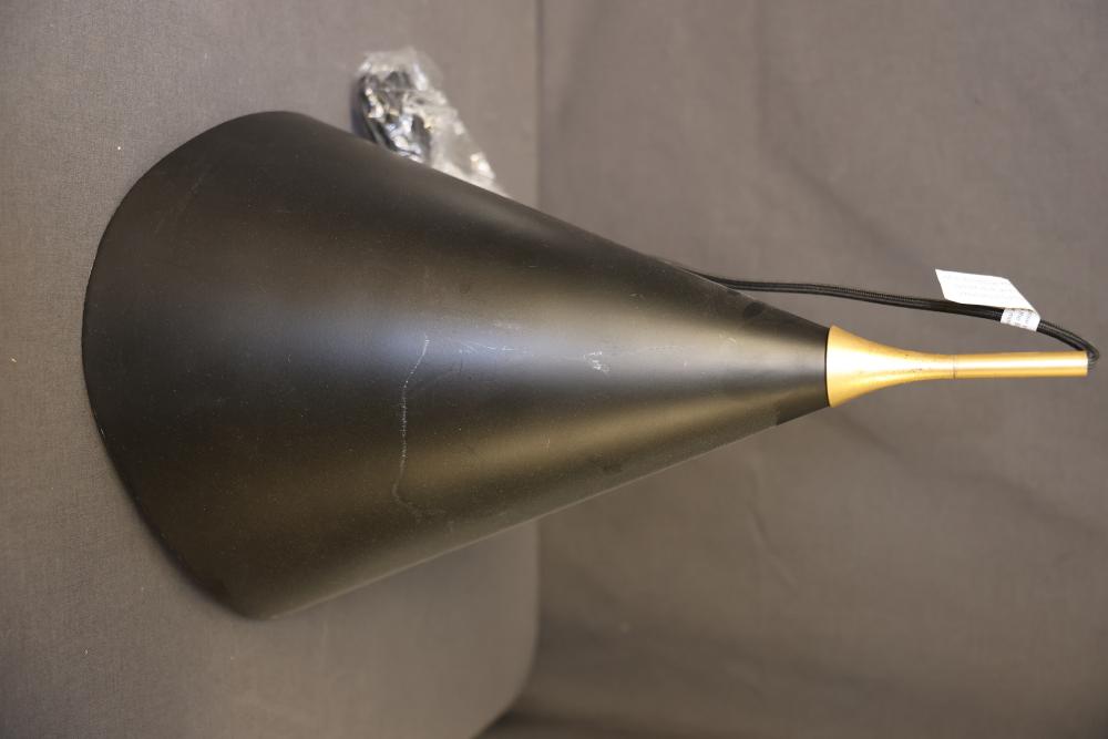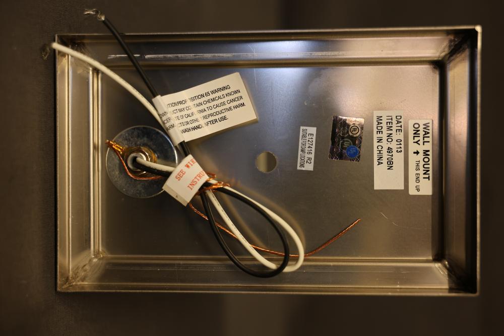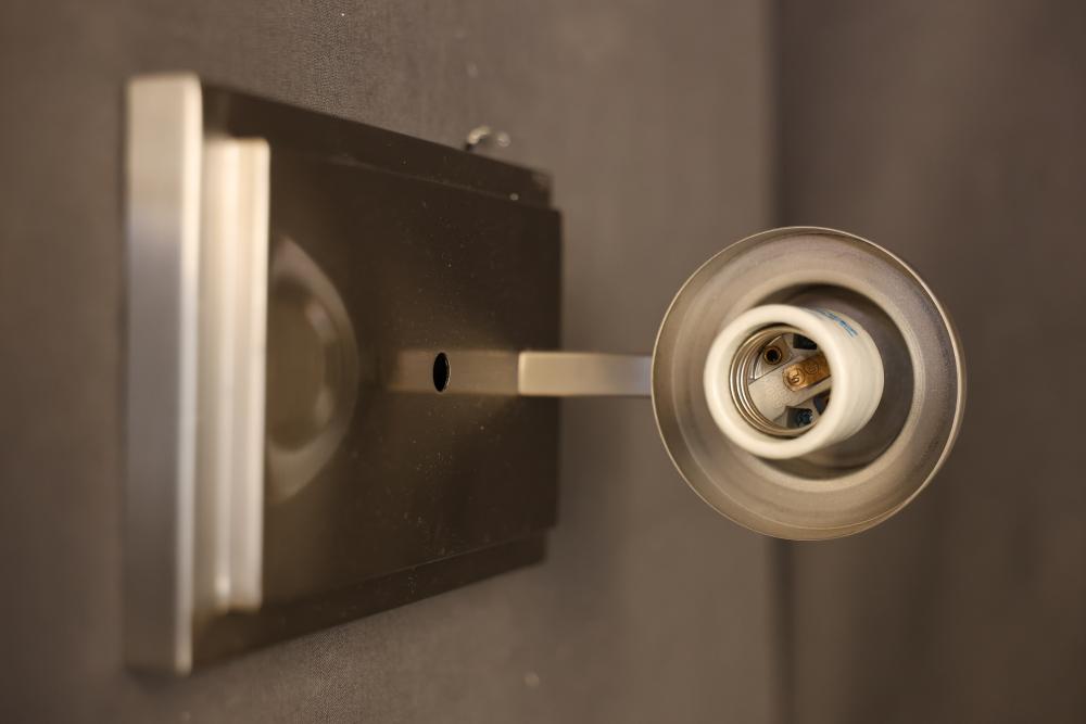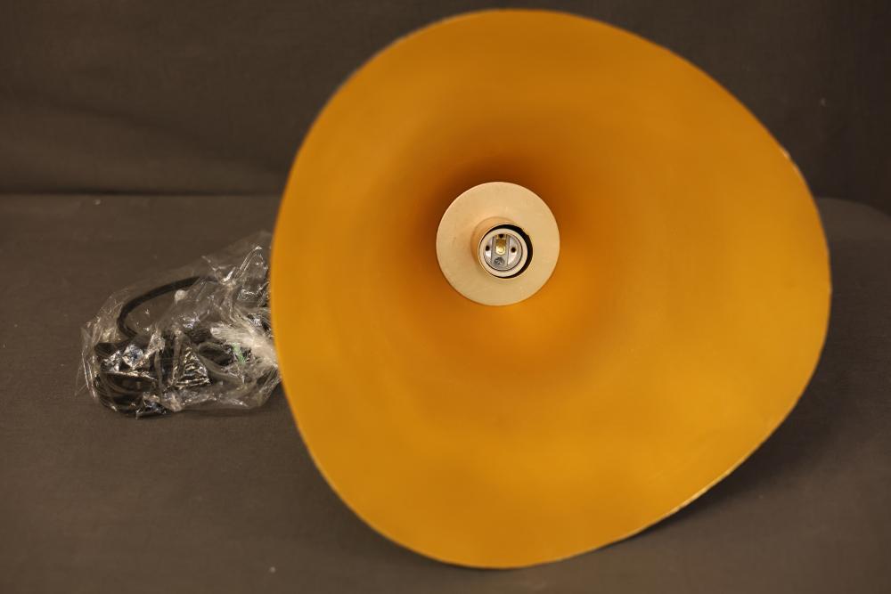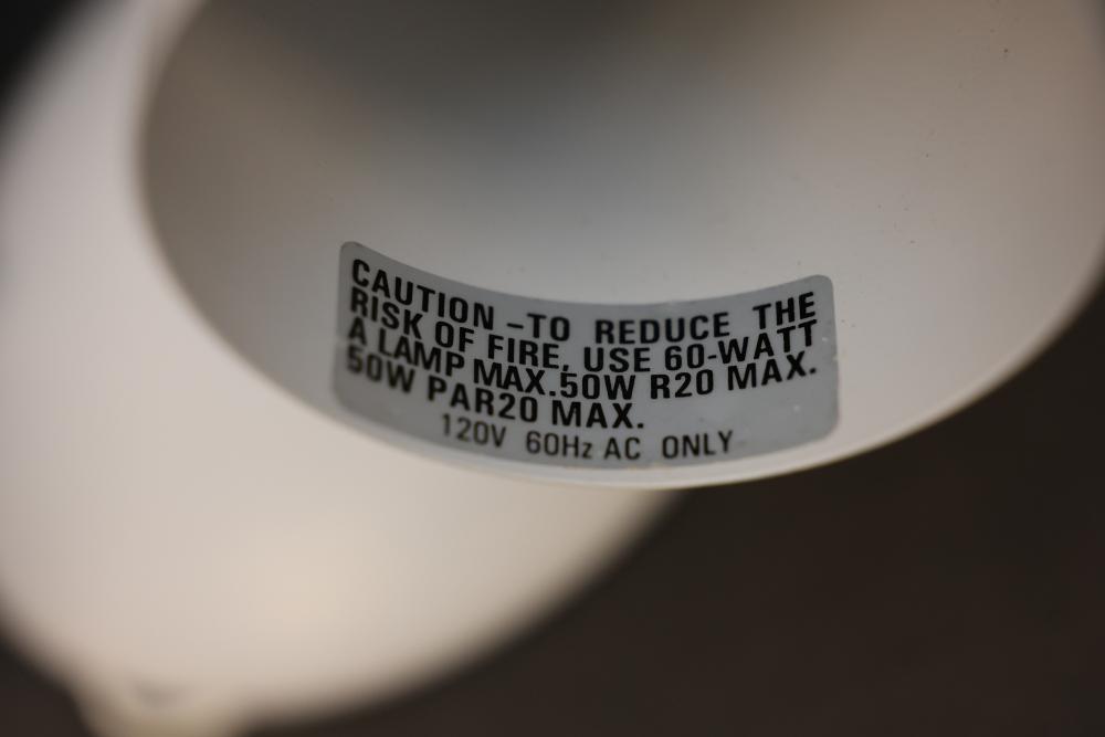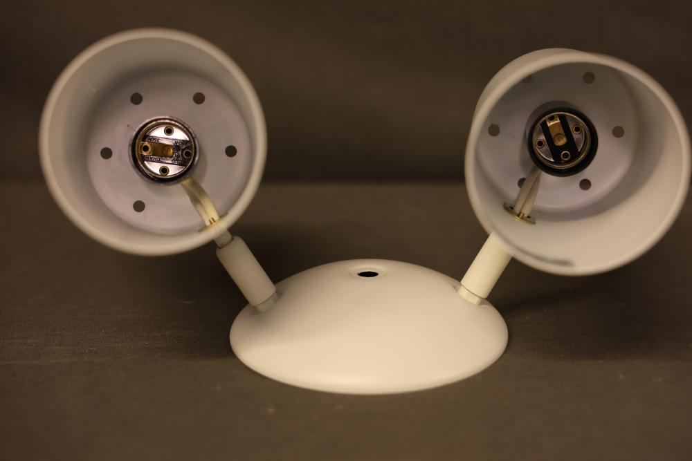 Wall-Mounted Light Fixtures with Metal Construction. Includes multiple light fixtures constructed for wall mounting and suitable for damp locations. Components include a black and gold cone-shaped fixture, dual white adjustable lamps, a rectangular white fixture, and a single-mount stainless steel lamp. Wear and scratches are visible on some pieces. Pickup only.