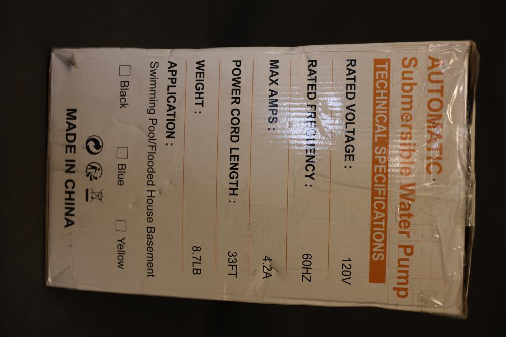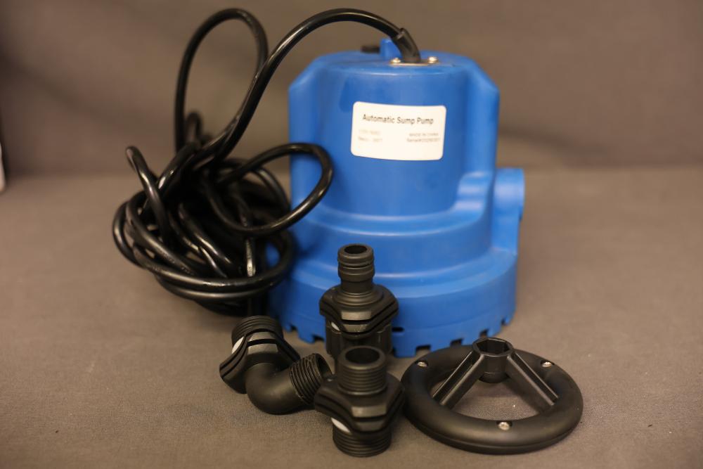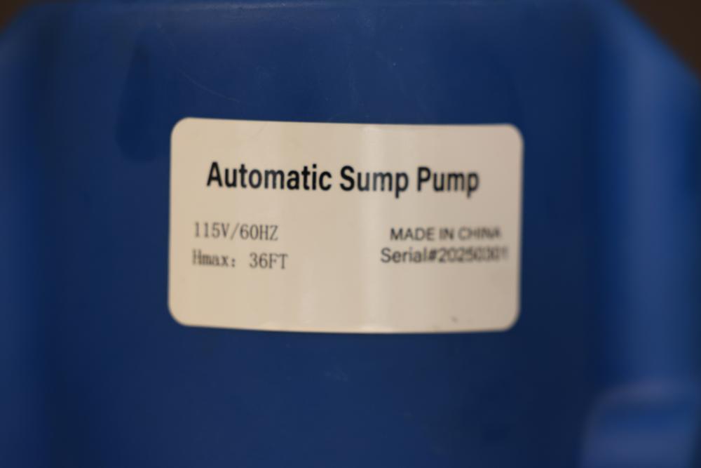 Blue Automatic Submersible Water Pump With Accessories. Includes a submersible pump rated at 115V/60Hz, maximum head of 36 feet, and a 33-foot power cord. Designed for applications such as swimming pools, flooded areas, or basements. Comes with multiple connectors and fittings for various configurations. Pickup only.