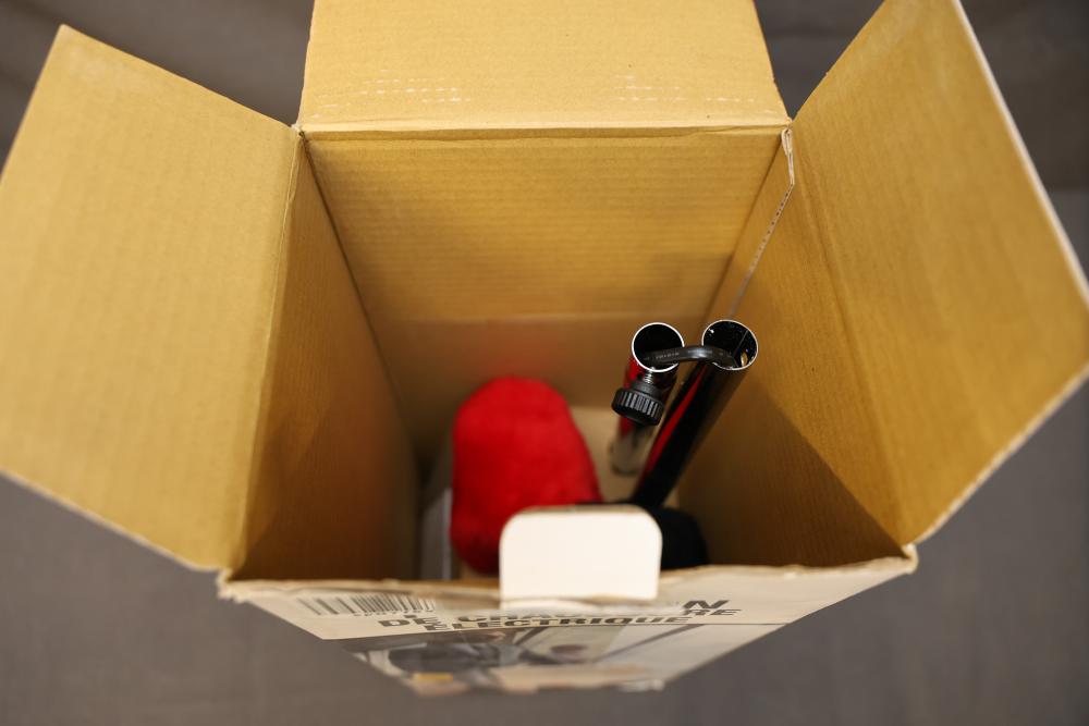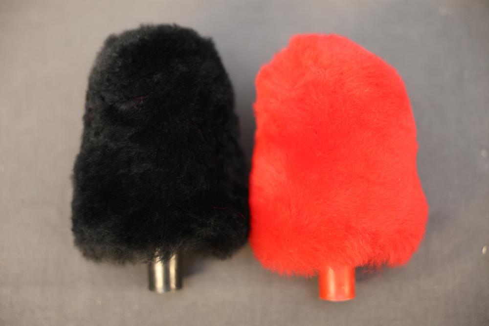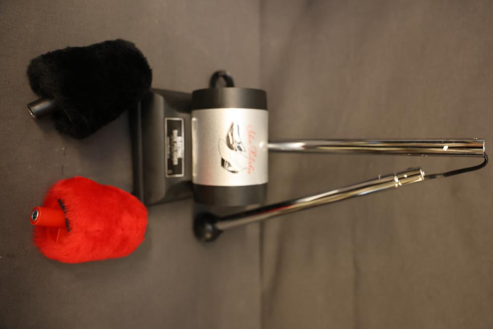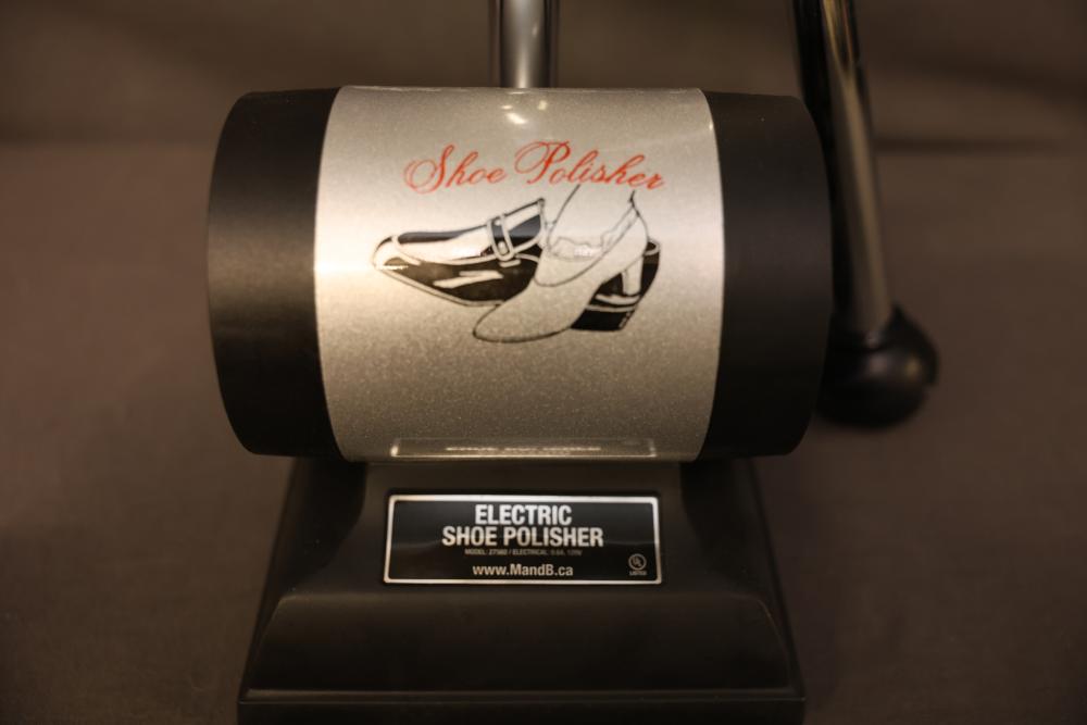 Electric Shoe Polisher with Dual Brushes and Power Cord. Includes a red and a black brush designed for different polishing needs. Features a sturdy base, chrome-finished handle, and a power cord connection. Comes in the original packaging with instructions. Pickup only.