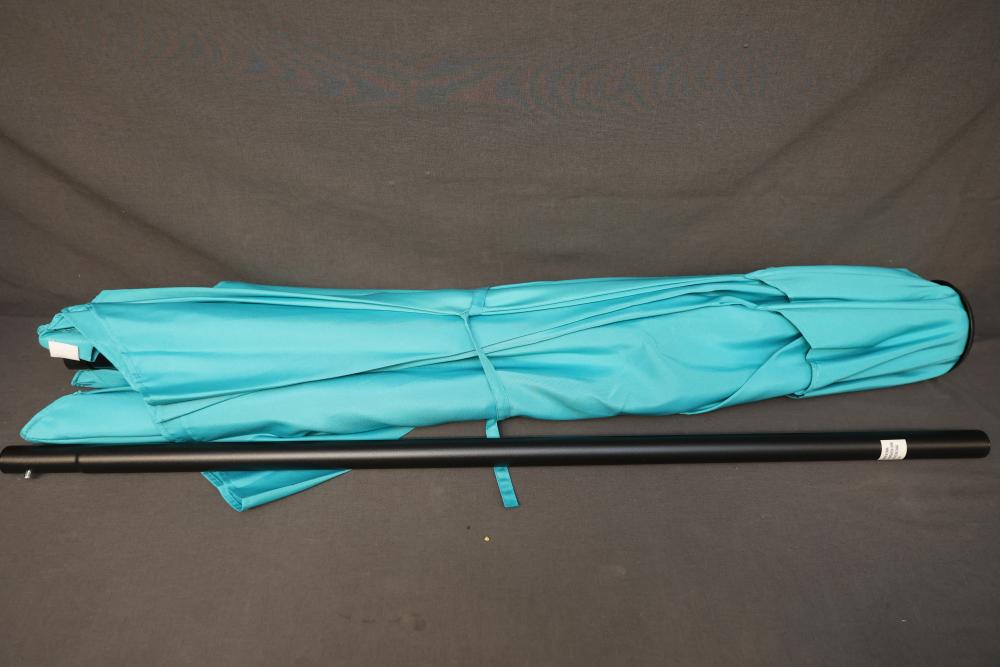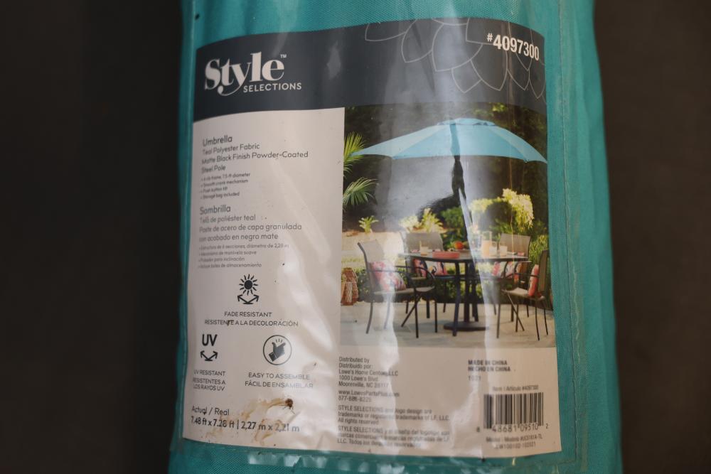 Style Selections Blue Outdoor Market Umbrella with Pole. Features UV-protection and durable fabric construction. Includes a coordinating black pole. Pickup only.
