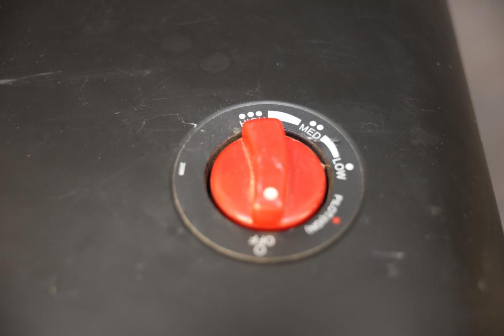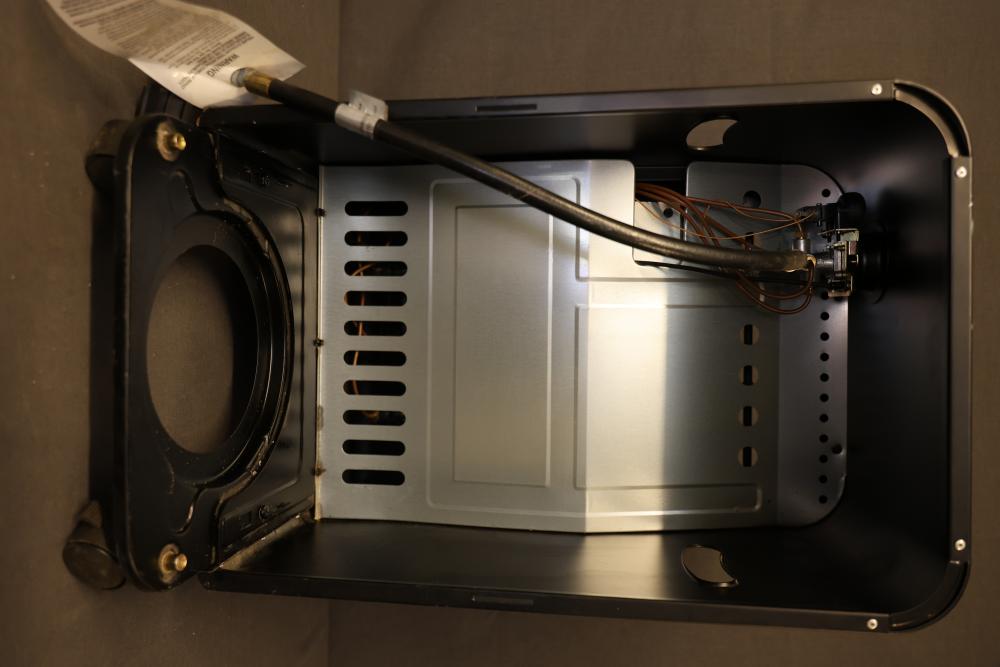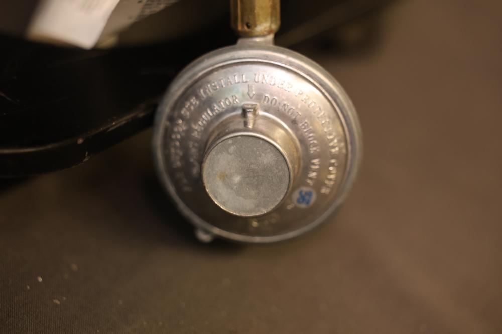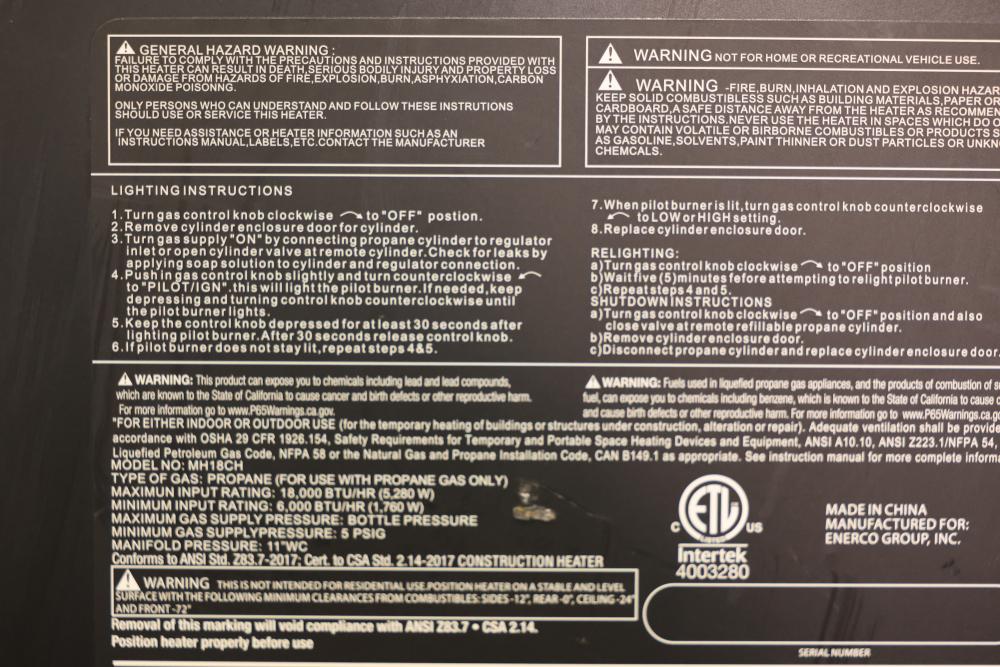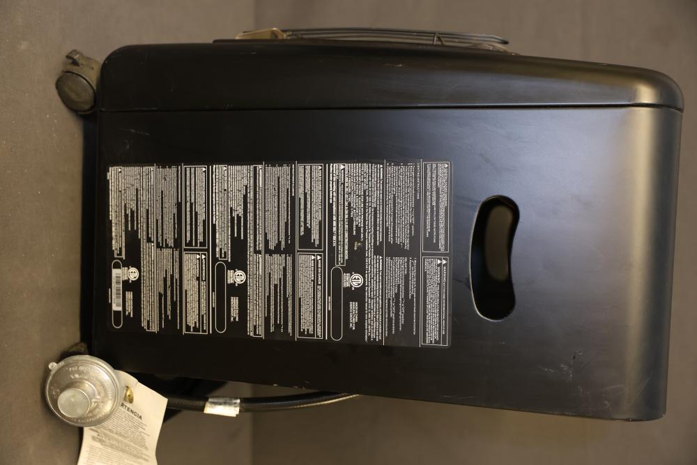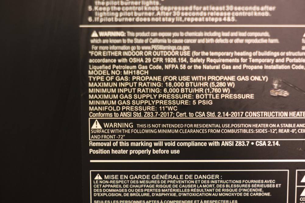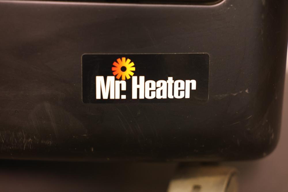 Mr. Heater Portable Propane Heater designed for indoor or outdoor use. Features a maximum output rating of 18,000 BTU/hr with adjustable heating levels. Requires propane gas and is equipped with safety features like a flame control knob and pressure regulator. Includes rolling casters and slots for easy handling. Pickup only.