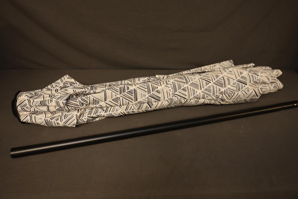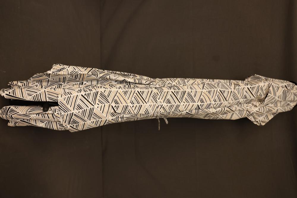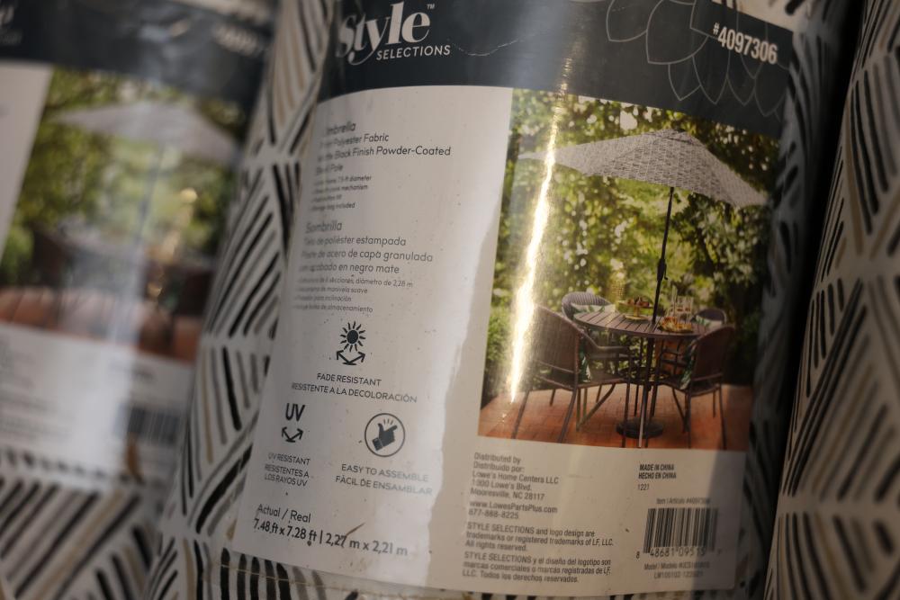 Style Selections 7-foot outdoor market umbrellas with a black and white geometric pattern. Includes fabric canopy and metal pole. Designed for sun protection with UV resistance. Lightweight and suitable for patios or outdoor seating areas. Pickup only.